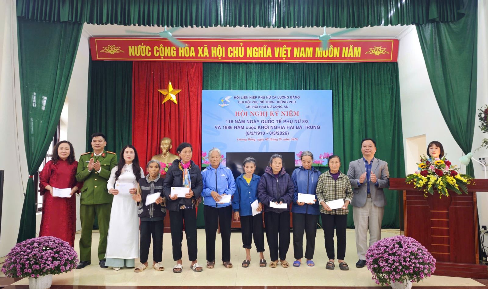 Nhân kỷ niệm 116 năm ngày quốc tế phụ nữ (8/3/1910 – 8/3/2026) và 1986 năm Khởi nghĩa Hai Bà Trưng; chiều ngày 08/3/2026 tại Nhà văn hoá thôn Dưỡng Phú, xã Lương Bằng, Chi hội phụ nữ Công an xã Lương Bằng đã tổ chức các hoạt động giao lưu, trao đổi thân tình với Chi hội phụ nữ thôn Dưỡng Phú, xã Lương Bằng.