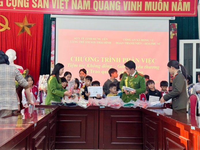 Bên cạnh hoạt động cắt tóc, Đoàn Thanh niên và Hội Phụ nữ Công an xã đã trao tặng nhiều suất quà thiết yếu bao gồm: Sách vở, đồ dùng học tập, Bánh kẹo và nhu yếu phẩm, các phần quà hỗ trợ đặc biệt cho những em có thành tích học tập xuất sắc. Những món quà tuy giá trị vật chất không quá lớn nhưng chứa đựng tình cảm, sự sẻ chia sâu sắc của cán bộ, chiến sĩ Công an xã Hồng Vũ, góp phần tiếp thêm động lực để các em vượt qua nghịch cảnh, vươn lên trong cuộc sống.