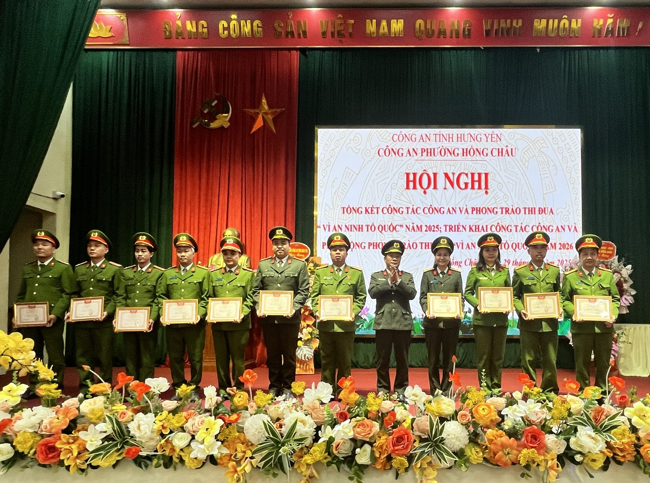 Với những kết quả đạt được, trong năm 2025, Công an phường Hồng Châu được công nhận là Đơn vị quyết thắng; Đảng bộ Công an phường được công nhận hoàn thành xuất sắc nhiệm vụ; có 02 cá nhân được Bộ Công an tặng Bằng khen; 01 cá nhân được Cục trưởng Cục Đào tạo tặng Giấy khen; 05 cá nhân được Giám đốc Công an tỉnh tặng Giấy khen; 01 tập thể và 13 cá nhân được Chủ tịch UBND phường Hồng Châu tặng Giấy khen.