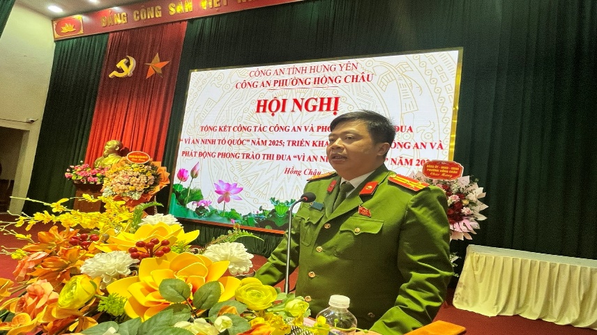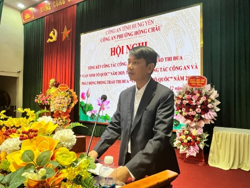 Phát biểu chỉ đạo tại Hội nghị, đồng chí Phó Bí thư Đảng ủy, Chủ tịch UBND phường Hồng Châu Lâm Bá Quyết đã ghi nhận, biểu dương và đánh giá cao những nỗ lực, cố gắng và thành tích mà tập thể Công an phường đã đạt được trong năm 2025. Đồng chí đề nghị, trong năm 2026, lực lượng Công an phường cần tập trung triển khai nghiêm túc các chủ trương, chỉ thị, nghị quyết của Đảng, pháp luật của Nhà nước, chỉ đạo của Bộ Công an và Công an tỉnh về công tác bảo đảm an ninh trật tự; chủ động nắm chắc tình hình địa bàn, đối tượng; kịp thời tham mưu cho Đảng ủy, chính quyền phường các giải pháp hiệu quả trong công tác bảo vệ an ninh quốc gia, bảo đảm trật tự an toàn xã hội, không để bị động, bất ngờ trong mọi tình huống; tăng cường công tác phòng ngừa, đấu tranh với các loại tội phạm, nhất là tội phạm công nghệ cao, tội phạm ma túy, trộm cắp, lừa đảo; nâng cao hiệu quả công tác quản lý nhà nước về an ninh trật tự, phòng cháy chữa cháy và trật tự đô thị; tiếp tục đẩy mạnh phong trào "Toàn dân bảo vệ an ninh Tổ quốc", xây dựng thế trận an ninh nhân dân vững chắc; phát huy vai trò của các tổ chức đoàn thể và Nhân dân trong công tác giữ gìn an ninh trật tự ở cơ sở.