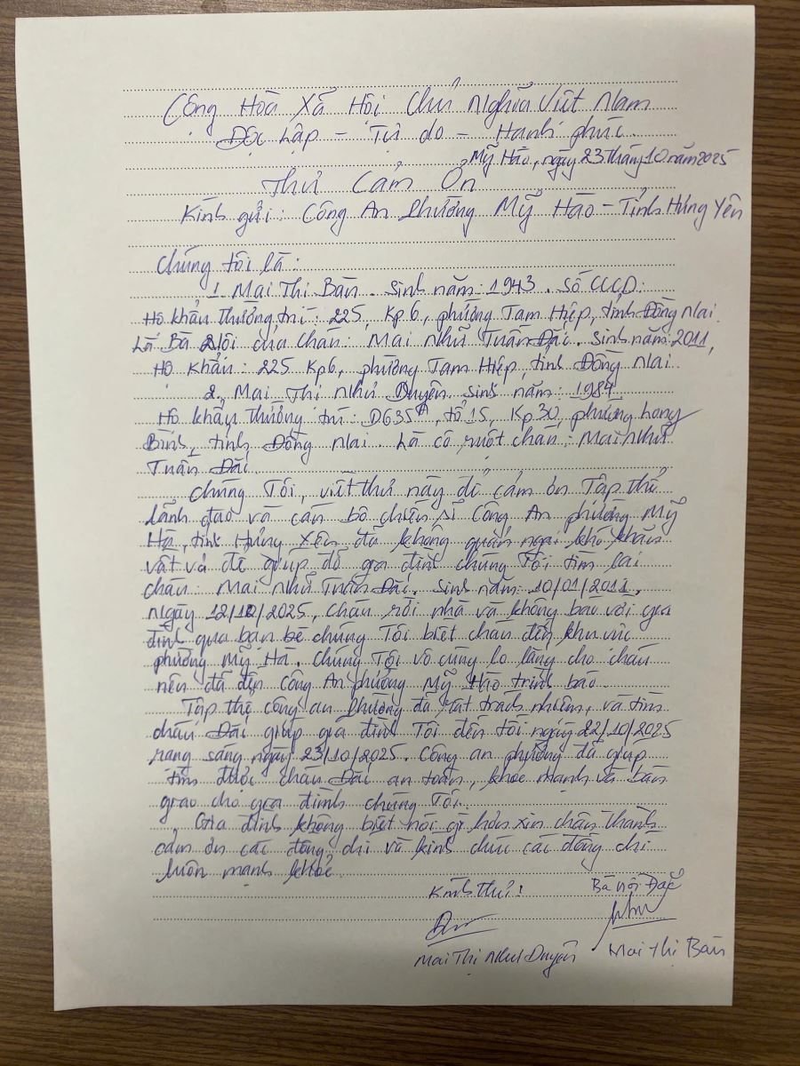 Nhận được thông tin, người thân của cháu Bắc đã khẩn trương di chuyển từ tỉnh Đồng Nai ra phường Mỹ Hào, tỉnh Hưng Yên để đón cháu. Sau khi hoàn tất các thủ tục xác minh, đến khoảng 2 giờ sáng ngày 23/10/2025, Công an phường Mỹ Hào đã tiến hành bàn giao cháu cho bà Mai Thị Bàn, sinh năm 1943, là bà nội của cháu để đưa cháu về nhà.