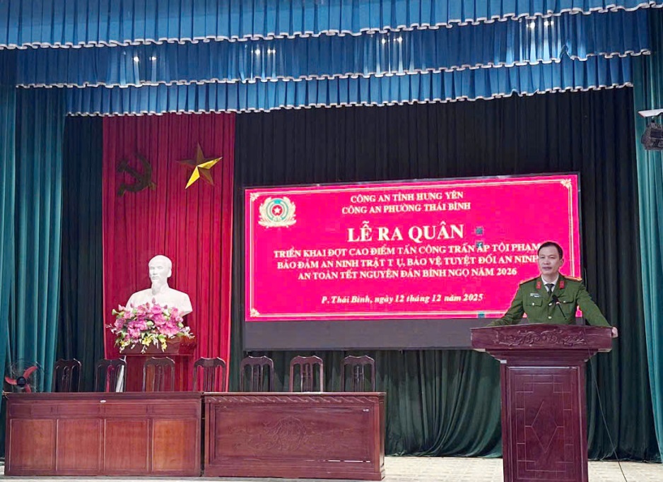 Nhằm tiếp tục giữ vững an ninh, trật tự, an toàn xã hội, bảo vệ tuyệt đối an ninh, an toàn Tết Nguyên đán Bính Ngọ 2026, các sự kiện lớn của đất nước, của tỉnh và bảo đảm bình yên cho nhân dân vui Tết đón xuân an lành; thực hiện chỉ đạo của Bộ trưởng Bộ Công an, của UBND tỉnh Hưng Yên, sáng ngày 12/12/2025, Công an phường Thái Bình đã tổ chức Lễ ra quân triển khai đợt cao điểm tấn công, trấn áp tội phạm bảo đảm an ninh, trật tự Tết Dương lịch, Lễ Giáng sinh và Tết Nguyên đán Bính Ngọ 2026.