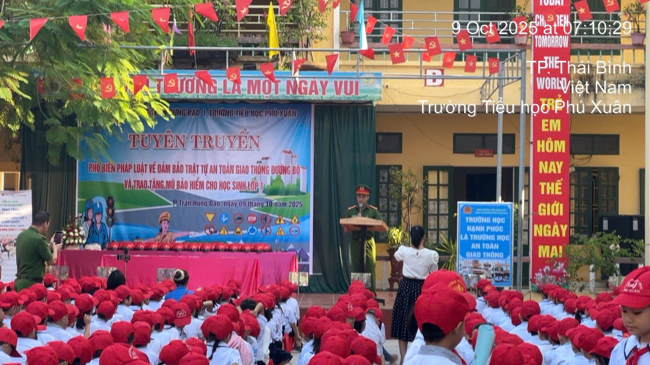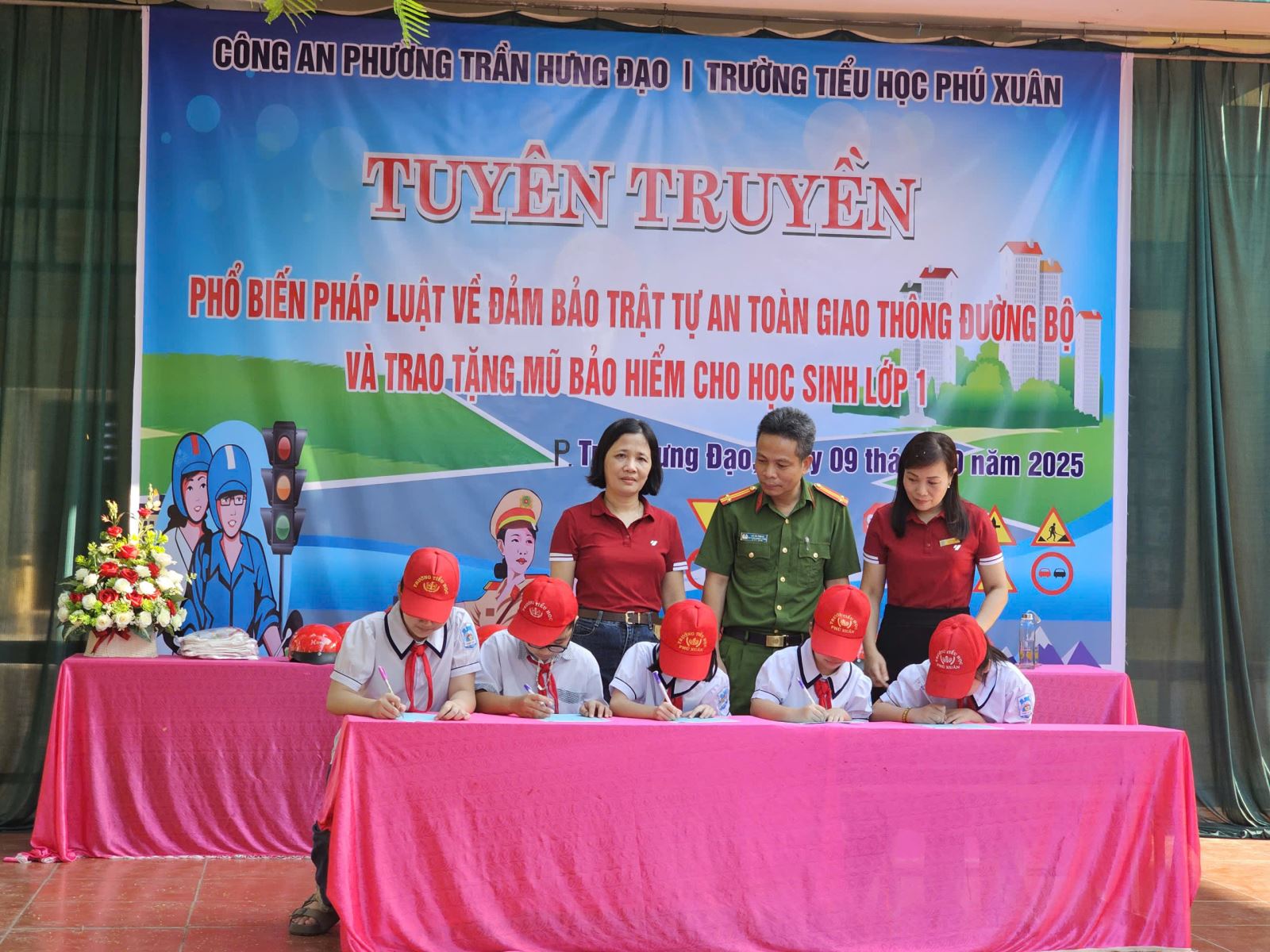 Ngày 09/10/2025, Công an phường Trần Hưng Đạo phối hợp trường Tiểu học Phú Xuân tổ chức tuyên truyền, phổ biến pháp luật về đảm bảo trật tự an toàn giao thông, trao tặng mũ bảo hiểm cho học sinh lớp 1.