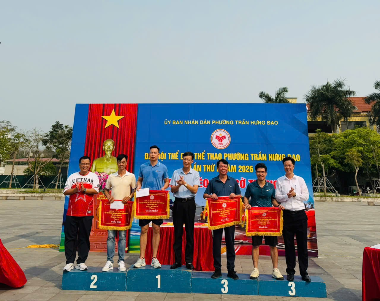 Các đồng chí lãnh đạo phường trao giải cho các vận động viên đạt thành tích xuất sắc môn kéo co