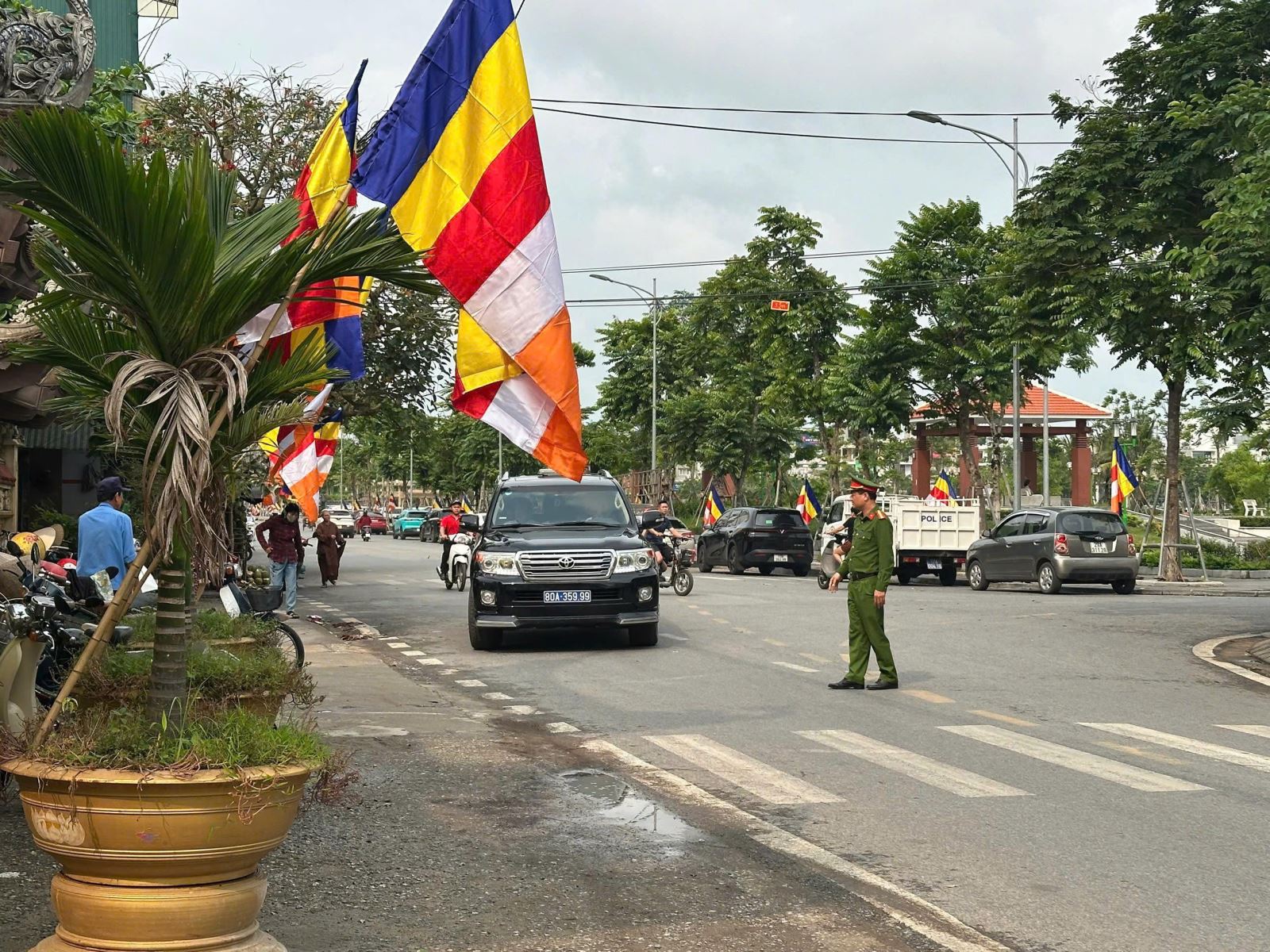 Công an phường triển khai lực lượng phân luồng, điều tiết phương tiện vào chùa Thánh Long