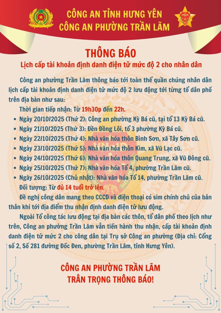Công an phường Trần Lãm đã phân công các tổ thu nhận tài khoản định danh điện tử mức độ 2, làm việc tất cả các ngày trong tuần từ 20/10 đến 26/10/2025 (buổi sáng từ 07h30 đến 11h30, buổi chiều từ 13h00 đến 17h00 tại trụ sở Công an phường – Cổng số 2, số 281 đường Đốc Đen, phường Trần Lãm, tỉnh Hưng Yên; buổi tối từ 19h30 đến 22h00 tại nhà văn hoá các thôn trên địa bàn phường) để thực hiện việc thu nhận thông tin cho công dân.