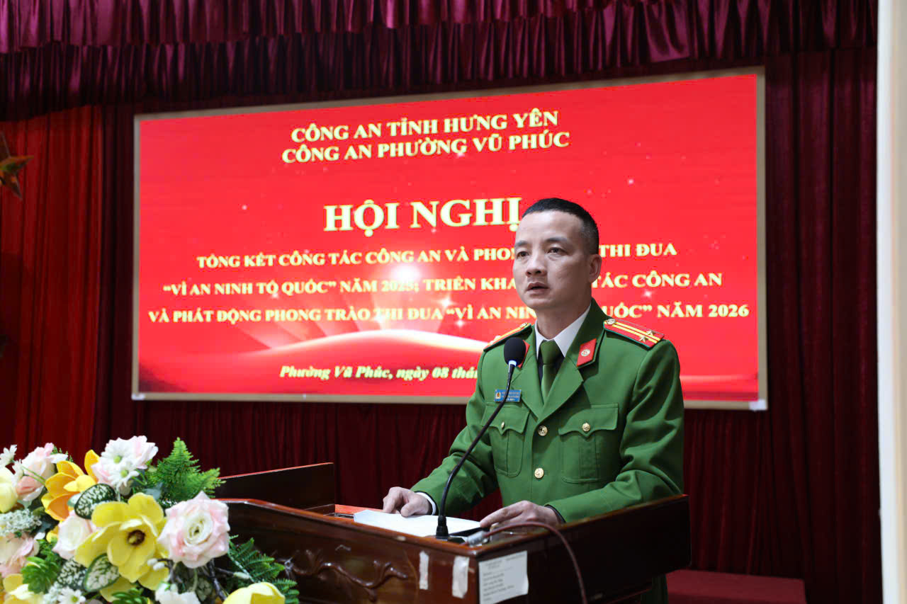 Tại hội nghị, đồng chí Trung tá Phan Minh Hoàng - Trưởng Công an phường đã triển khai Chỉ thị của Ban Thường vụ Đảng uỷ phường về tăng cường công tác bảo đảm an ninh, trật tự năm 2026; Kế hoạch của UBND phường về đảm bảo an ninh, trật tự trên địa bàn phường Vũ Phúc năm 2026. Tiếp đó, đồng chí Phó trưởng Công an phường đã triển khai Nghị quyết của Công an phường về lãnh đạo công tác Công an năm 2026, Kế hoạch công tác Công an năm 2026; phát động phong trào thi đua “Vì an ninh Tổ quốc” năm 2026, trong đó xác định 05 mục tiêu, 03 yêu cầu đối với chỉ huy, cán bộ chiến sĩ Công an phường. Bám sát phương châm hành động năm 2026: “Theo lời Bác dạy - Đổi mới tư duy, nâng cao tri thức - Chính quy, hiện đại - Vì Đảng, vì dân” để triển khai thực hiện 04 nhóm giải pháp trọng tâm, “đột phá” là: Tiếp tục làm tốt công tác tham mưu Đảng ủy, Lãnh đạo Công an tỉnh, cấp ủy, chính quyền địa phương chỉ đạo toàn diện công tác Công an; tập trung xây dựng đội ngũ cán bộ Công an phường liêm chính, kỷ luật, chuyên nghiệp, hiện đại, nhân văn và gần dân; chấn chỉnh, nâng cao hiệu quả các hoạt động nghiệp vụ; chuyển đổi toàn diện phương thức làm việc kết hợp chặt chẽ giữa truyền thống và hiện đại, chuyển đổi trạng thái từ thủ công sang ứng dụng khoa học công nghệ.