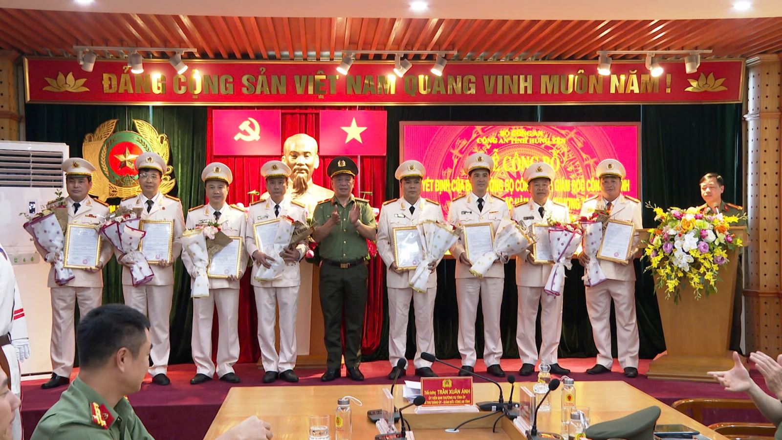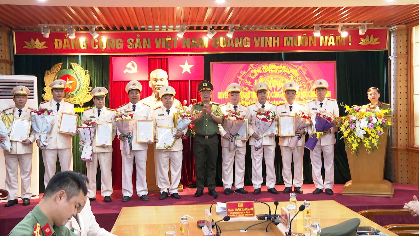 Đồng chí Thiếu tướng Trần Xuân Ánh, UVBTV Tỉnh ủy, Giám đốc Công an tỉnh trao quyết định thăng cấp bậc hàm từ Thượng tá lên Đại tá cho 18 đồng chí là Trưởng các phòng nghiệp vụ Công an tỉnh