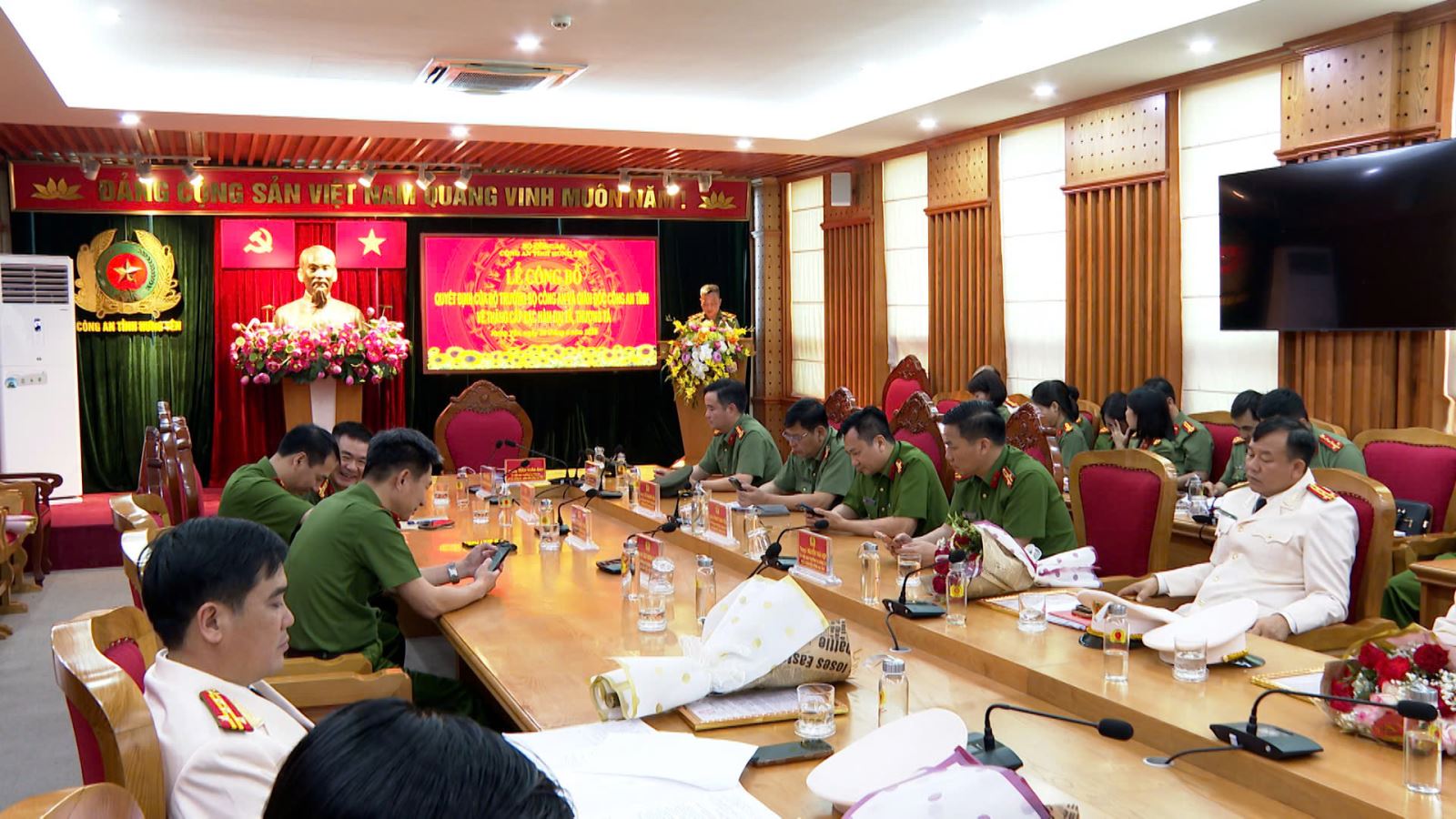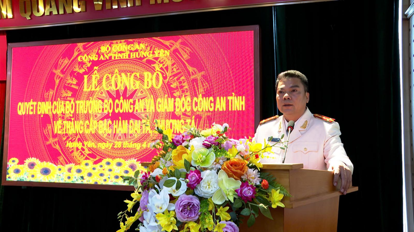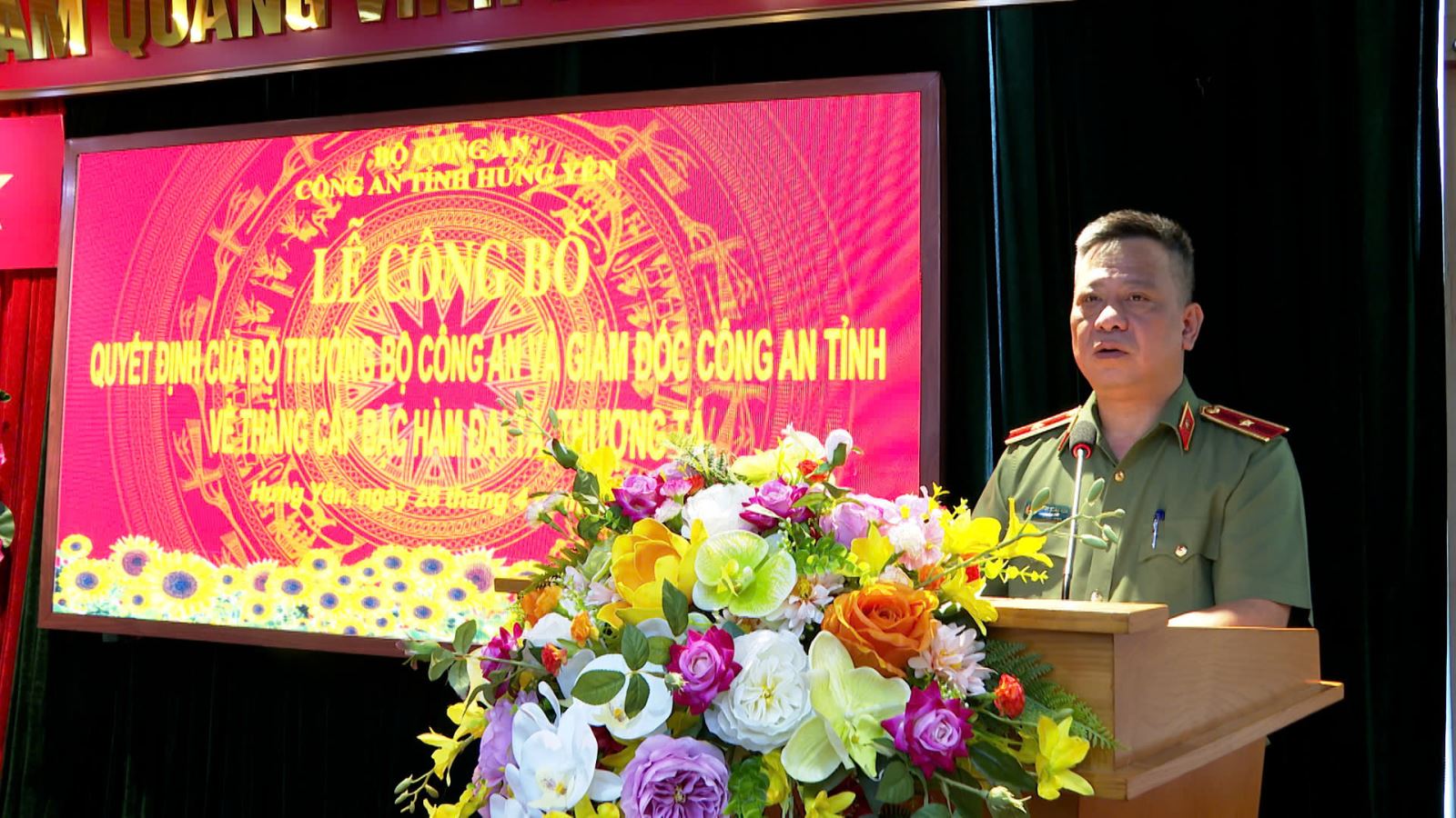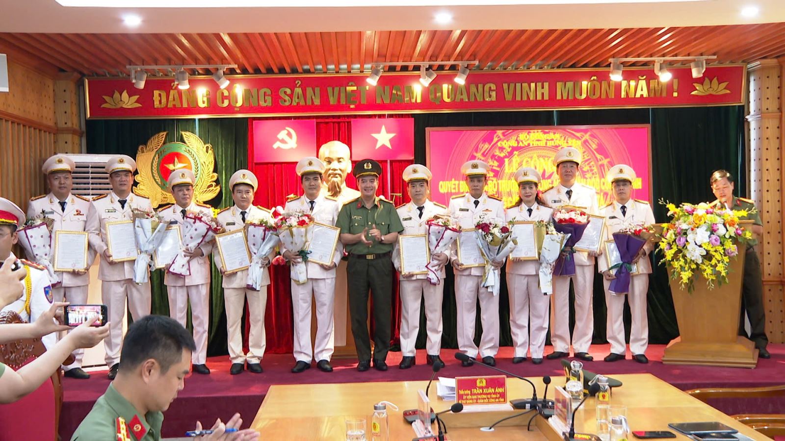 Tại buổi lễ, sau khi lãnh đạo phòng Tổ chức cán bộ thừa ủy quyền của Giám đốc Công an tỉnh công bố các quyết định thăng cấp bậc hàm. Thừa ủy quyền của Bộ trưởng Bộ Công an, Thiếu tướng Trần Xuân Ánh, Giám đốc Công an tỉnh đã trao quyết định thăng cấp bậc hàm từ Thượng tá lên Đại tá cho 18 đồng chí là Trưởng các phòng nghiệp vụ Công an tỉnh. Tiếp đó, đồng chí Đại tá Nguyễn Thành Sơn, Phó Bí thư Đảng ủy, Phó Giám đốc Công an tỉnh đã trao quyết định thăng cấp bậc hàm từ Trung tá lên Thượng tá cho các đồng chí đại diện 54 đồng chí là đội trưởng các đơn vị nghiệp vụ và Trưởng Công an các xã, phường.