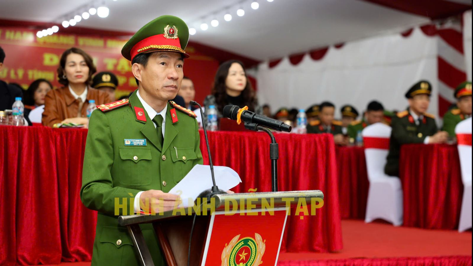 Đồng chí Phó Giám đốc Công an tỉnh, Trưởng Ban chỉ đạo diễn tập phát biểu tại buổi diễn tập