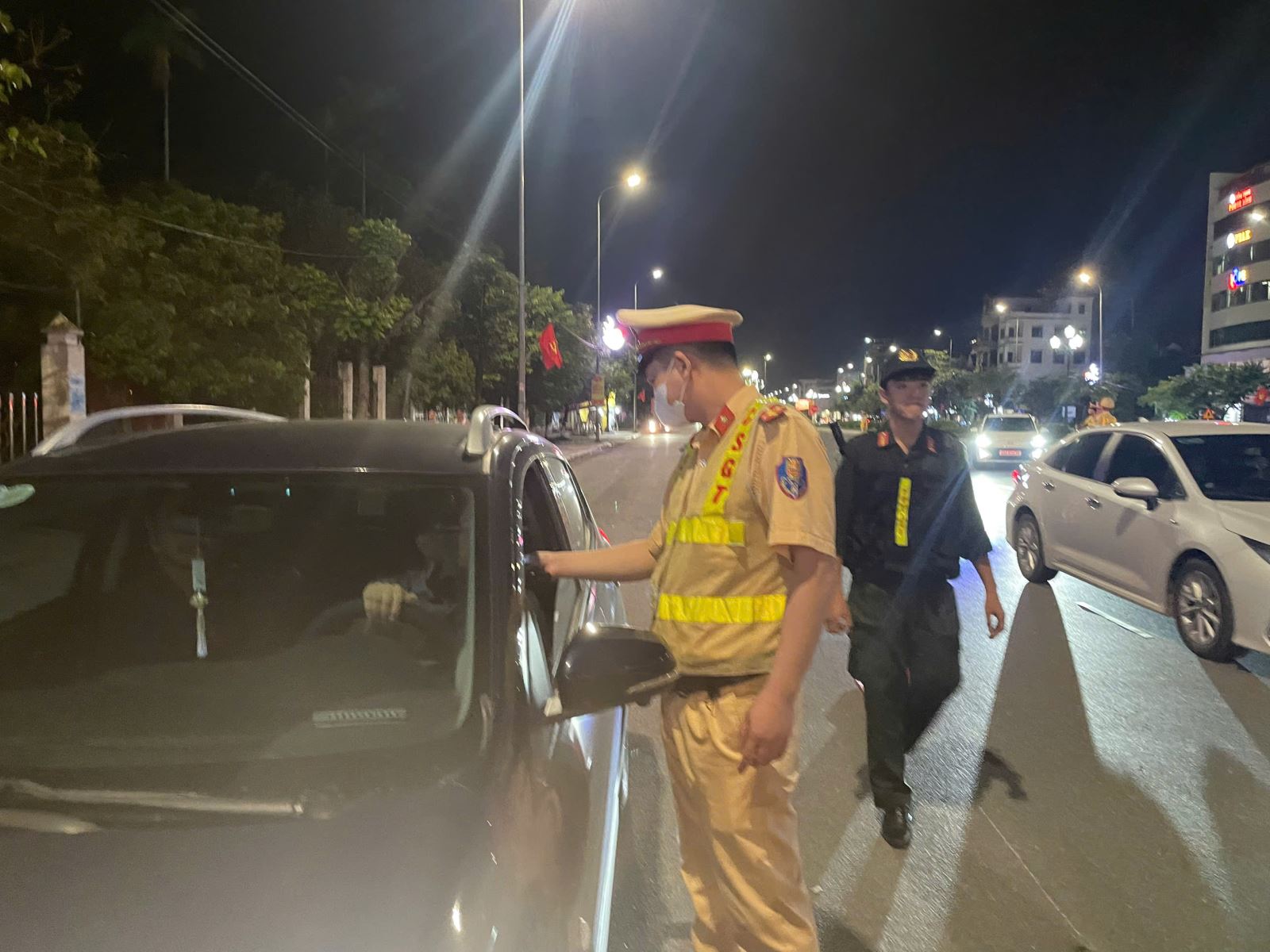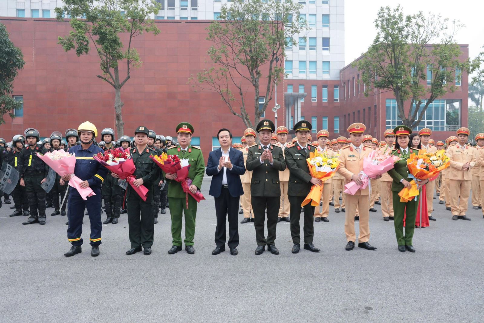 Đồng chí Chủ tịch UBND tỉnh, đồng chí Giám đốc Công an tỉnh tặng hoa động viên các lực lượng thực hiện đợt cao điểm