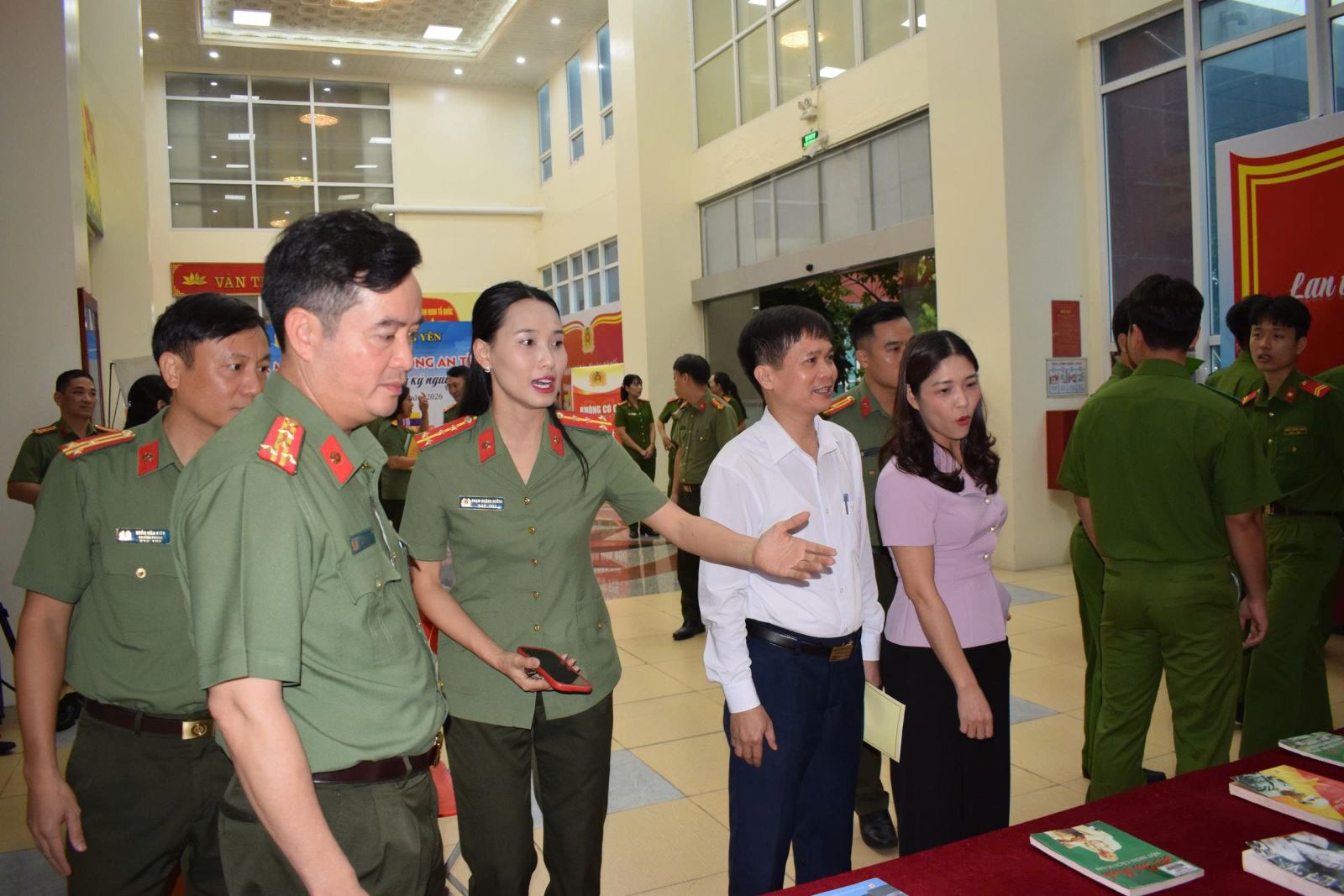 Đồng chí Phó Bí thư Đảng ủy, Phó Giám đốc Công an tỉnh cùng các đại biểu và cán bộ chiến sỹ tham quan, chụp ảnh lưu niệm tại khu vực trưng bày, triển lãm sách