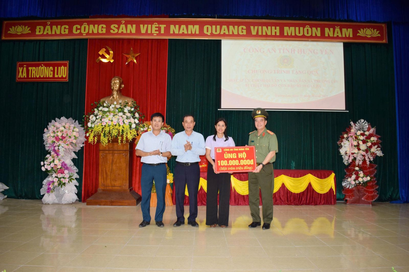 Thay mặt lãnh đạo và cán bộ chiến sĩ Công an tỉnh Hưng Yên, Đại tá Nguyễn Thành Sơn - Phó Bí thư Đảng ủy, Phó Giám đốc Công an tỉnh Hưng Yên đã trao 100 triệu đồng hỗ trợ địa phương khắc phục hậu quả sau bão; đồng thời tặng nhiều phần quà thiết thực cho các hộ dân có hoàn cảnh khó khăn, bị thiệt hại nặng do mưa bão gây ra.