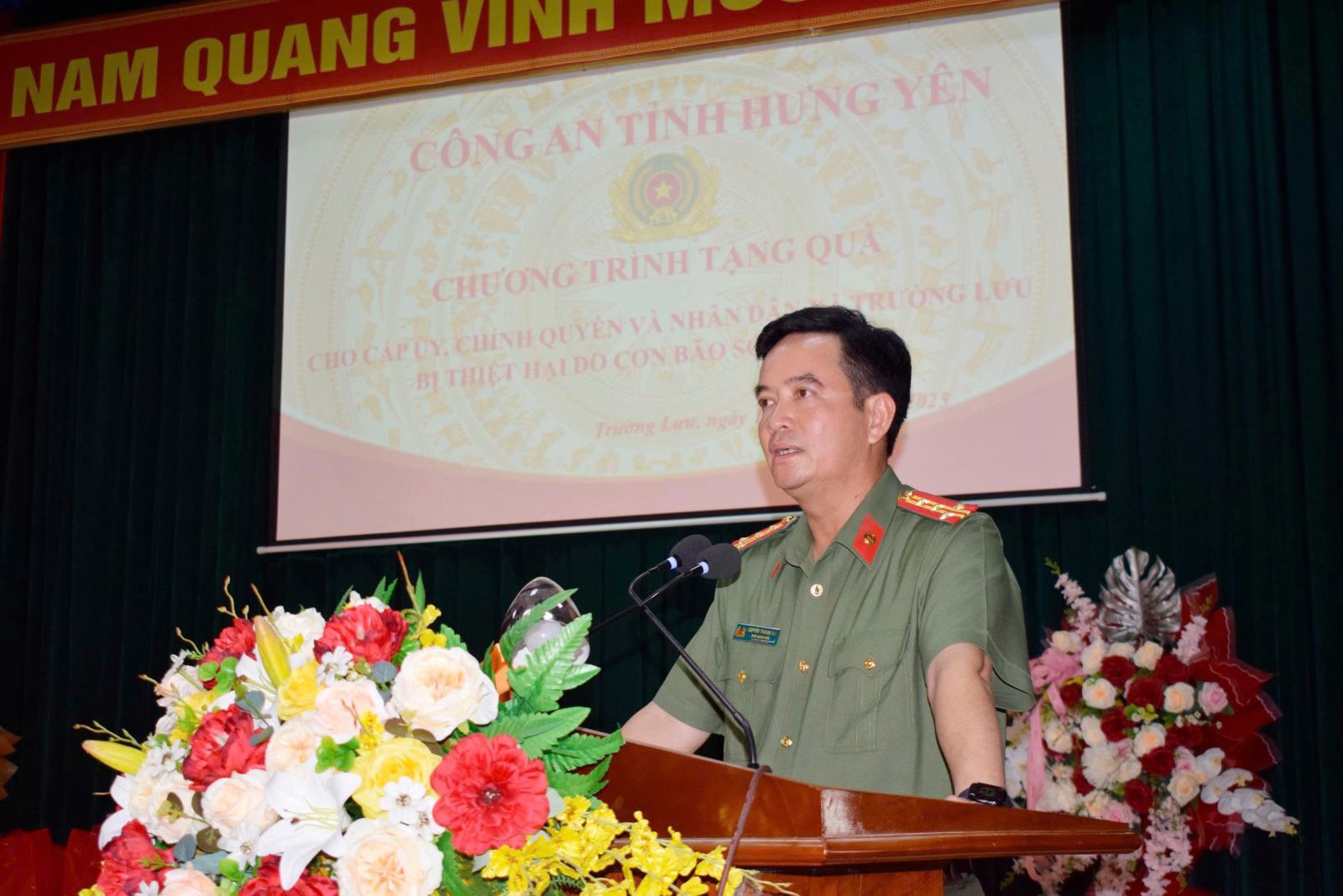 Phát biểu chia sẻ, động viên cán bộ và nhân dân, đồng chí Phó Bí thư Đảng ủy, Phó Giám đốc Công an tỉnh Hưng Yên nêu rõ: Với tinh thần “tương thân tương ái”, “lá lành đùm lá rách”, cán bộ, chiến sĩ Công an tỉnh Hưng Yên luôn hướng về đồng bào miền Trung cùng các địa bàn bị thiệt hại do thiên tai gây ra, mong muốn được góp phần nhỏ bé giúp bà con vượt qua khó khăn, sớm ổn định cuộc sống và khôi phục sản xuất. Đồng chí tin tưởng rằng, với sự nỗ lực của chính quyền và nhân dân địa phương, cùng sự chung tay của cả nước, xã Trường Lưu sẽ sớm khắc phục hậu quả thiên tai, tiếp tục triển khai các nhiệm vụ phát triển kinh tế - xã hội tại địa phương.