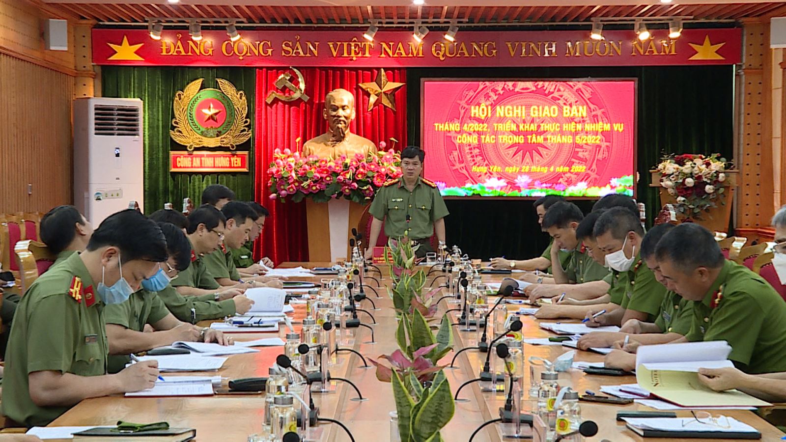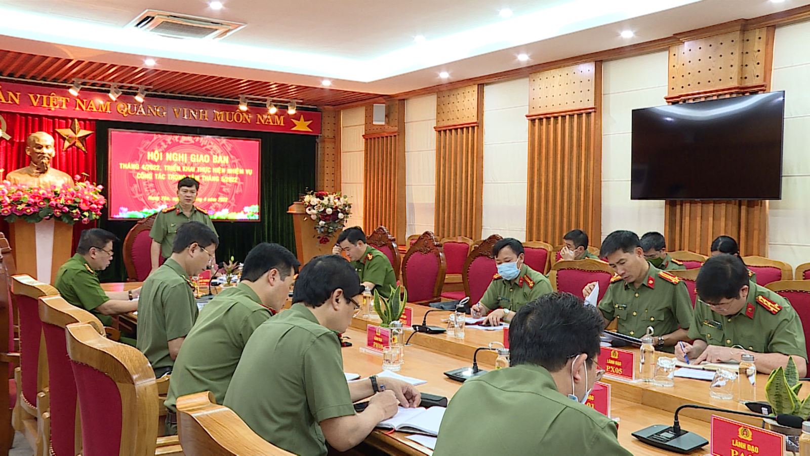 Sau khi nghe báo cáo tình hình, kết quả thực hiện các nhiệm vụ công tác của Công an các đơn vị, địa phương, các đồng chí lãnh đạo Công an tỉnh đã ghi nhận, biểu dương những cố gắng, nỗ lực cùng thành tích mà Công an các đơn vị, địa phương đã đạt được trong tháng. Đồng thời, đưa ra các ý kiến nhận xét, đánh giá cụ thể đối với từng lĩnh vực được phân công phụ trách và chỉ đạo một số nhiệm vụ trọng tâm trong tháng tiếp theo. Trong đó, chỉ đạo Công an các đơn vị, địa phương tiếp tục phát huy những thành tích đã đạt được, nghiêm túc kiểm điểm, rút kinh nghiệm những hạn chế, thiếu sót, chủ động rà soát tiến độ các chương trình, kế hoạch, chỉ tiêu công tác đề ra từ đầu năm và tập trung thực hiện tốt các nội dung công tác trong thời gian tiếp theo. Tập trung làm tốt công tác xây dựng đảng, xây dựng lực lượng; chủ động nắm tình hình; triển khai các biện pháp đảm bảo an ninh quốc gia, giữ gìn trật tự an toàn xã hội, tiếp tục thực hiện công tác phòng, chống dịch bệnh Covid-19. Nâng cao hiệu quả công tác nghiệp vụ cơ bản; quyết liệt đấu tranh với các loại tội phạm và tệ nạn xã hội; đẩy nhanh tiến độ điều tra, giải quyết các vụ án, vụ việc; tăng cường công tác tuần tra vũ trang, quản lý cư trú, quản lý vũ khí vật liệu nổ, công cụ hỗ trợ, các ngành nghề kinh doanh có điều kiện về an ninh trật tự, đảm bảo trật tự an toàn giao thông và phòng chống cháy nổ; đẩy mạnh phong trào toàn dân bảo vệ an ninh Tổ quốc... Trước mắt là triển khai đồng bộ các biện pháp đảm bảo an ninh, an toàn dịp nghỉ lễ 30/4 – 1/5/2022.