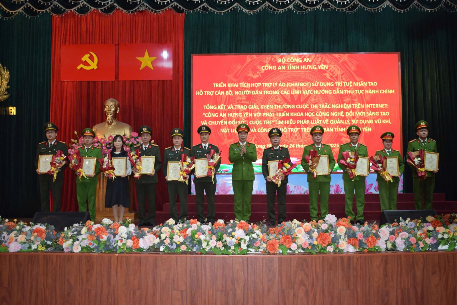 Ngày 24/11/2025, Công an tỉnh Hưng Yên tổ chức tổng kết và trao giải Cuộc thi trắc nghiệm trực tuyến “Công an tỉnh Hưng Yên với phát triển khoa học, công nghệ, đổi mới sáng tạo và chuyển đổi số”; Cuộc thi “Tìm hiểu pháp luật về quản lý, sử dụng vũ khí, vật liệu nổ, công cụ hỗ trợ” trên địa bàn tỉnh Hưng Yên. Dự chương trình tổng kết và trao giải có đồng chí Thiếu tướng Trần Xuân Ánh, Ủy viên Ban Thường vụ Tỉnh ủy, Bí thư Đảng ủy, Giám đốc Công an tỉnh, cùng dự có các đồng chí Phó Giám đốc Công an tỉnh.