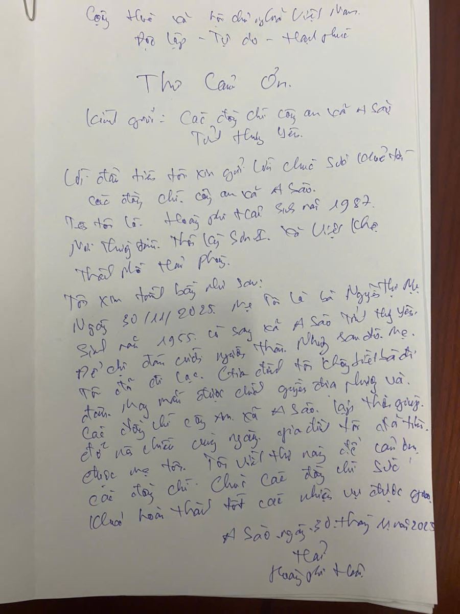 Sau sự việc, anh Hoàng Phi Hải đã gửi thư cảm ơn bày tỏ sự xúc động và trân trọng cảm ơn Công an xã A Sào đã nhanh chóng hỗ trợ, giúp đỡ gia đình tìm thấy và đưa mẹ anh trở về bình an.