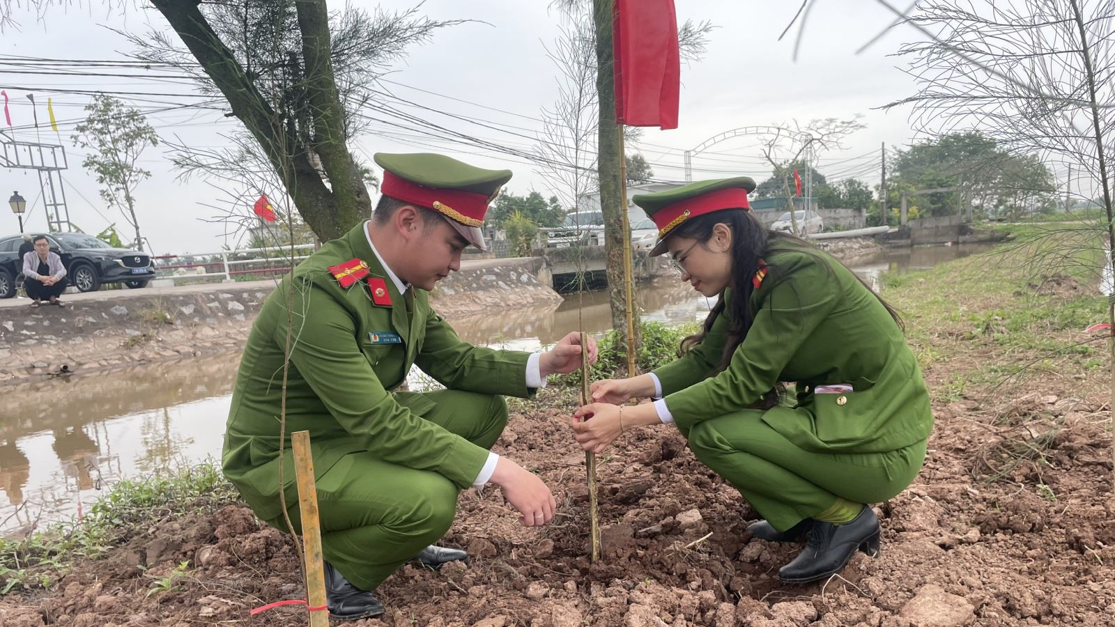 Công an xã phối hợp trồng cây tại khu vực đình làng thôn Lũ Phong