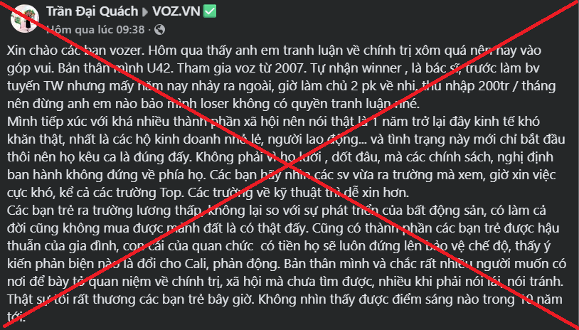 Gần đây trên một số diễn đàn mạng xã hội, xuất hiện bài viết của một cá nhân tự xưng là “bác sĩ thành đạt”, “thu nhập 200 triệu/tháng” để đưa ra những nhận định đầy bi quan về tình hình đất nước. Với cái mác “người thành công”, đối tượng đã khéo léo cài cắm những quan điểm lệch lạc, phủ nhận nỗ lực của Chính phủ và gieo rắc sự tuyệt vọng cho giới trẻ về tình hình kinh tế - xã hội hiện nay. Tuy nhiên, nếu soi xét kỹ dưới góc độ logic và thực tiễn, chúng ta sẽ thấy đây thực chất là những luận điệu ngụy biện, thiếu khách quan của những phần tử xấu.