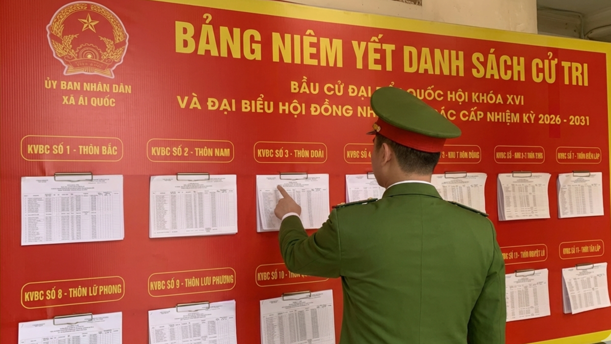 Công an xã Ái Quốc phối hợp kiểm tra việc niêm yết danh sách cử tri tại các điểm bầu cử