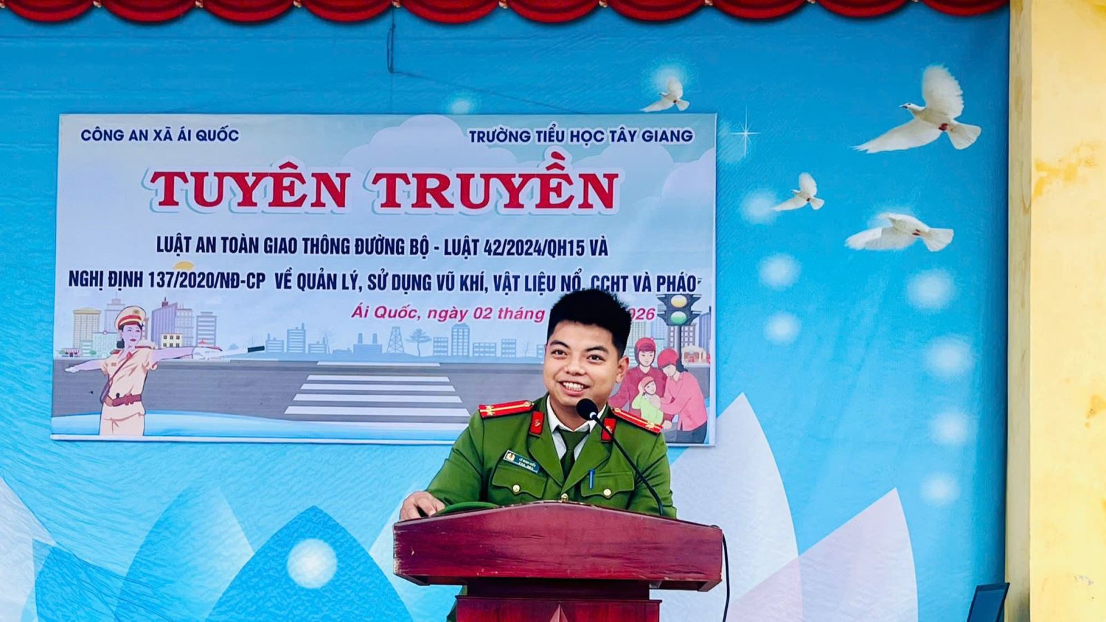 Sáng ngày 03/02/2026, Công an xã Ái Quốc đã tổ chức tuyên truyền pháp luật về trật tự an toàn giao thông, pháp luật về vũ khí, vật liệu nổ, công cụ hỗ trợ và pháo cho trên 500 cán bộ, giáo viên và học sinh trường Tiểu học Tây Giang.