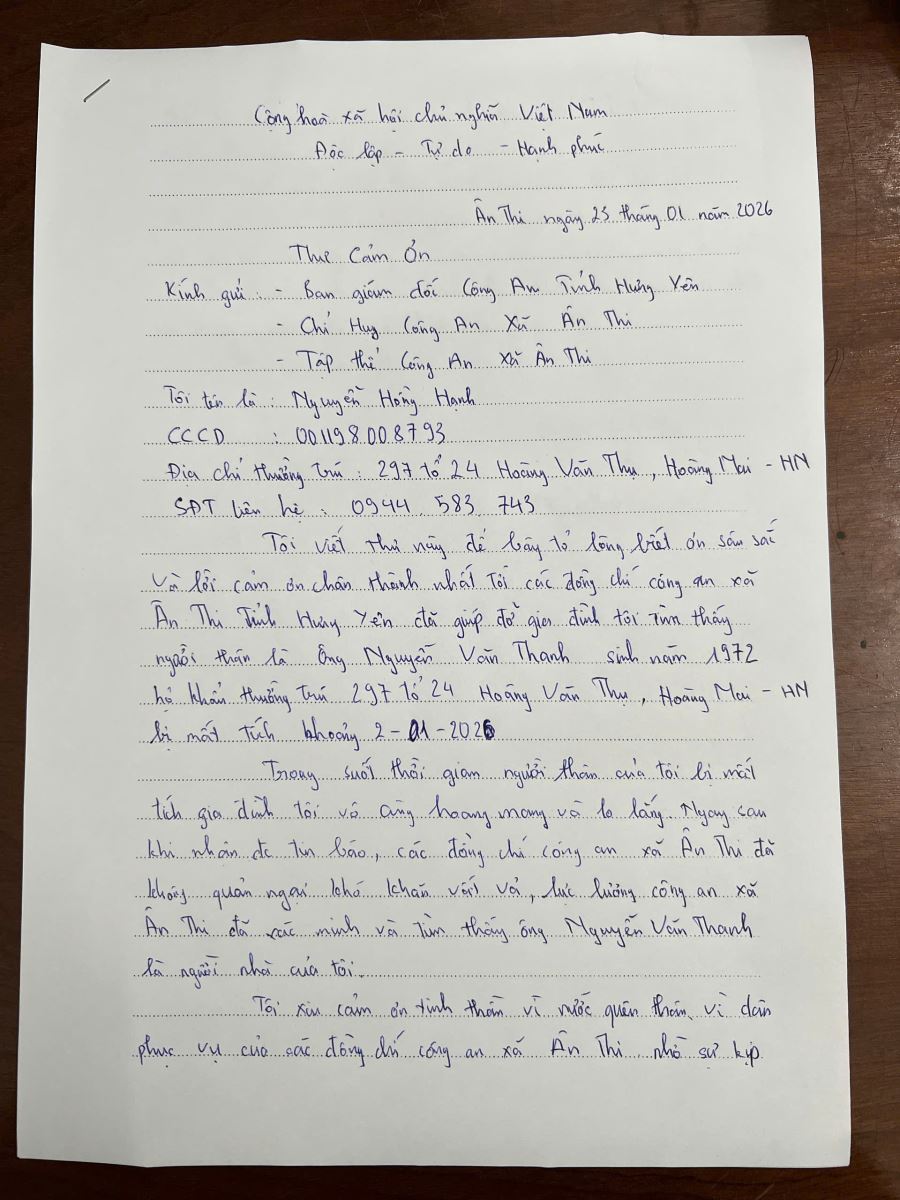 Công an xã Ân Thi đã liên hệ công tác với Công an phường Hoàng Mai, thành phố Hà Nội xác minh thông tin công dân trên và thông báo tới người nhà ông Nguyễn Văn Thanh về việc ông đi lạc tại xã Ân Thi hiện tại đang ở Công an xã để người nhà đến nhận, đưa ông Thanh về đoàn tụ cùng với gia đình. Khoảng 10 giờ ngày 23/01/2026, vợ và con ông Thanh đã đến trụ sở Công an xã Ân Thi nhận ông Thanh và cho biết: ông Thanh mất tích từ ngày 02/01/2026, gia đình rất hoang mang, lo lắng và trình báo cơ quan công an nơi thường trú tuy nhiên vẫn chưa tìm được tung tích người nhà. Đến nay khi nhận được thông báo của Công an xã Ân Thi, gia đình vô cùng biết ơn và gửi lời cảm ơn sâu sắc tới toàn thể cán bộ chiến sĩ Công an xã Ân Thi.