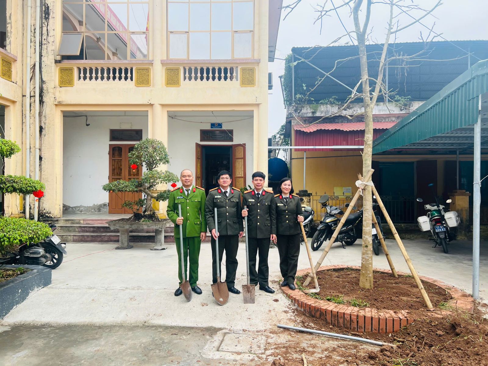 Chỉ huy cùng cán bộ Công an xã tham gia trồng cây xanh tại đơn vị