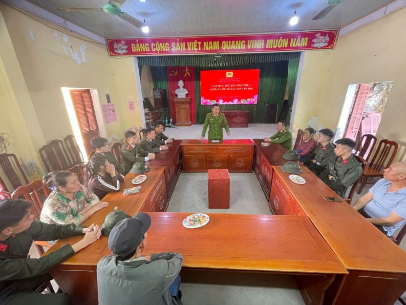 Phát biểu động viên tại buổi gặp mặt, đồng chí Thiếu tá Đinh Thanh Tiến - Trưởng Công an xã, đại diện Ban Chỉ huy Công an xã mong muốn các tân binh phát huy truyền thống quê hương, giữ vững bản lĩnh chính trị, chấp hành nghiêm kỷ luật, tích cực học tập, rèn luyện trong môi trường công tác mới; nỗ lực hoàn thành tốt nhiệm vụ được giao, xứng đáng là người chiến sĩ Công an nhân dân cách mạng trong mái nhà chung của Bộ Công an.