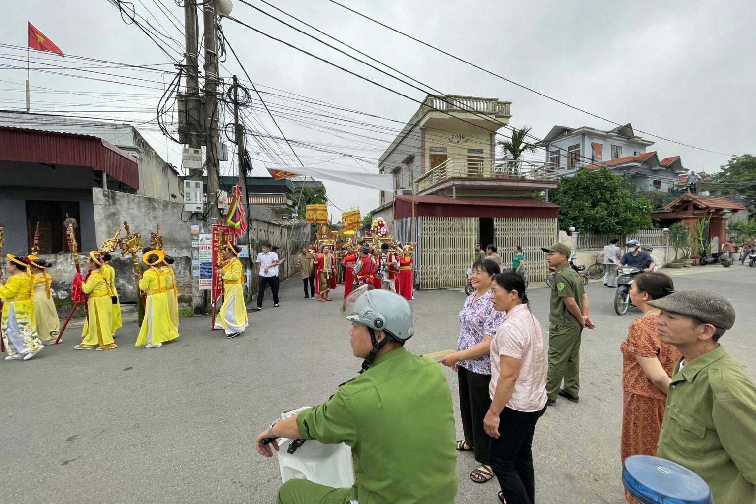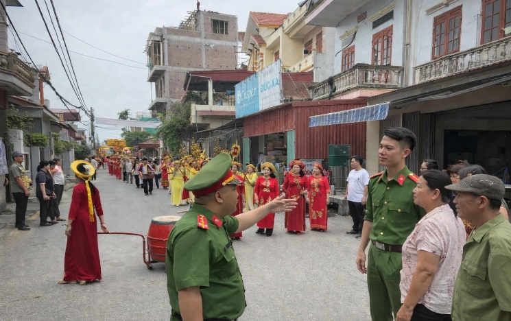 Công an xã phối hợp cơ sở Thôn tiến hành nhắc nhở người dân hai bên đường khi đoàn rước đi qua