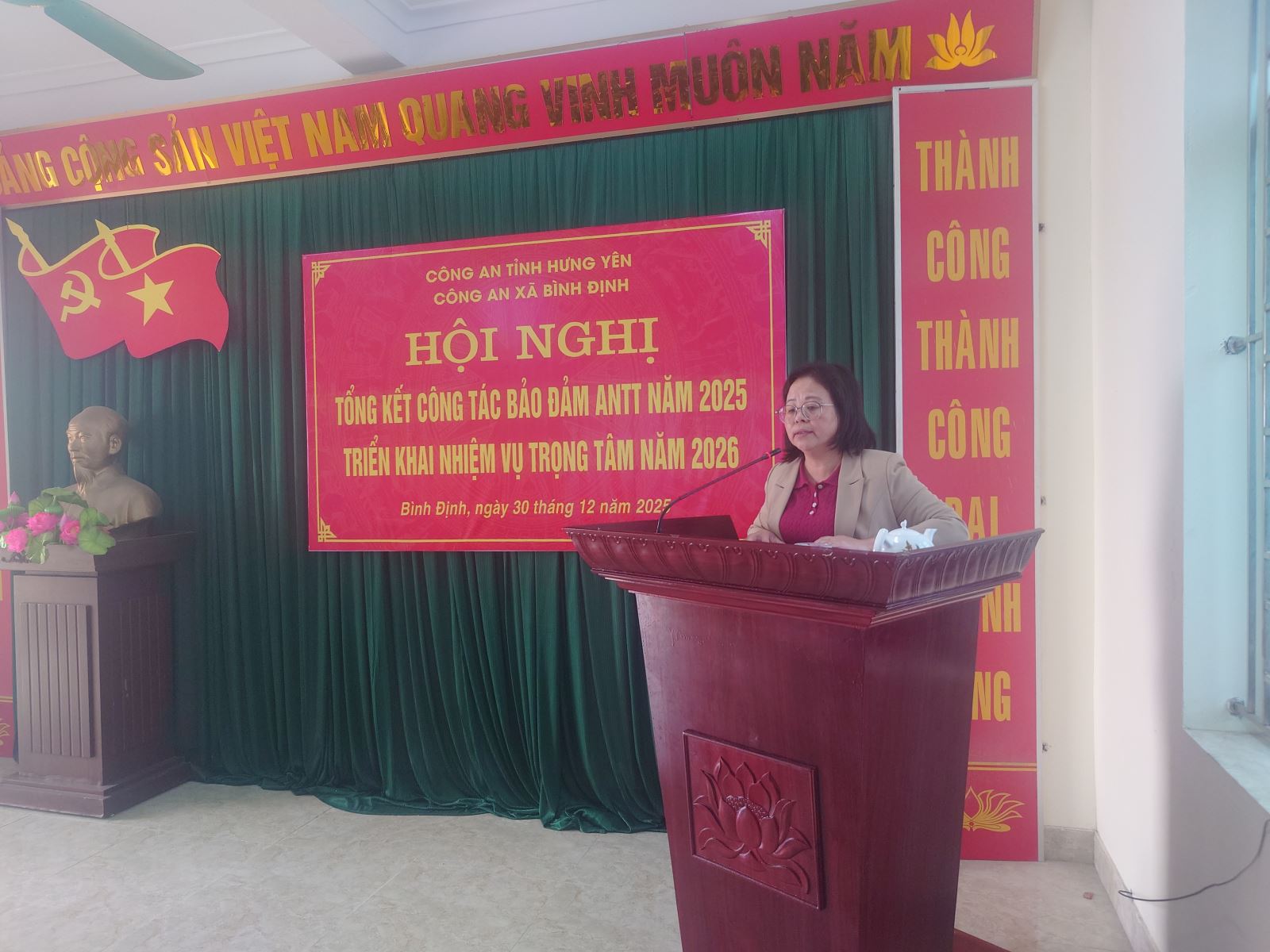Phát biểu chỉ đạo hội nghị, đồng chí Bí thư Đảng uỷ, Chủ tịch HĐND xã đã ghi nhận, biểu dương những kết quả, thành tích mà Công an xã Bình Định đã đạt được trong năm 2025, trong đó đơn vị đã được Công an tỉnh công nhận danh hiệu Đơn vị quyết thắng. Đồng thời, đồng chí Bí thư Đảng uỷ, Chủ tịch HĐND xã cũng đề nghị Công an xã tiếp tục phát huy những mặt tích cực, khắc phục những hạn chế, triển khai đồng bộ các biện pháp công tác nhằm bảo vệ vững chắc an ninh quốc gia, bảo đảm trật tự an toàn xã hội, đấu tranh có hiệu quả với các loại tội phạm, trong bối cảnh các sự kiện trọng đại như Đại hội đại biểu toàn quốc lần thứ XIV của Đảng, bầu cử Quốc hội khoá XVI và đại biểu Hội đồng Nhân dân các cấp nhiệm kỳ 2026-2031 sắp diễn ra.