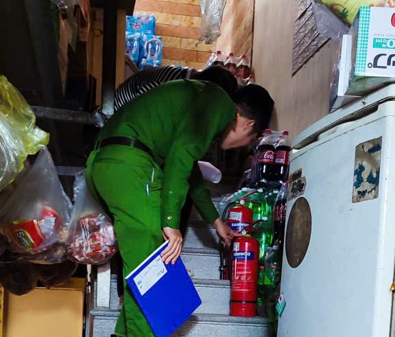 Cán bộ Công an xã kiểm tra các điều kiện bảo đảm an toàn PCCC