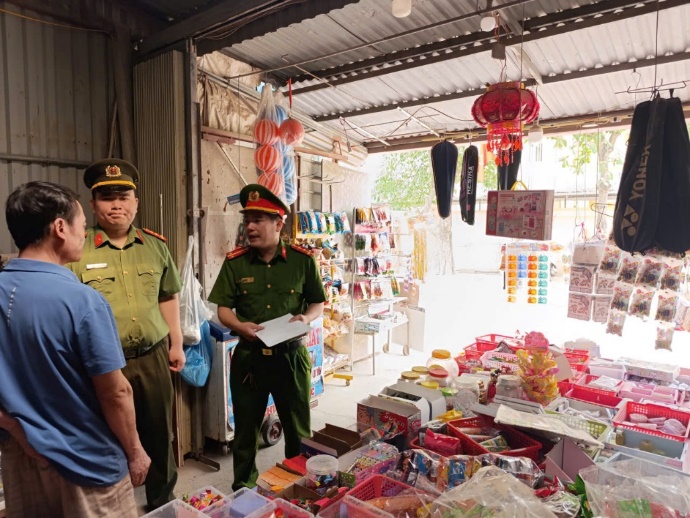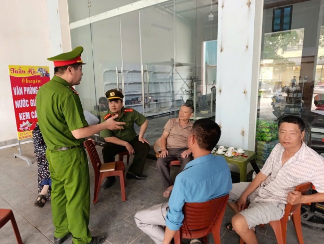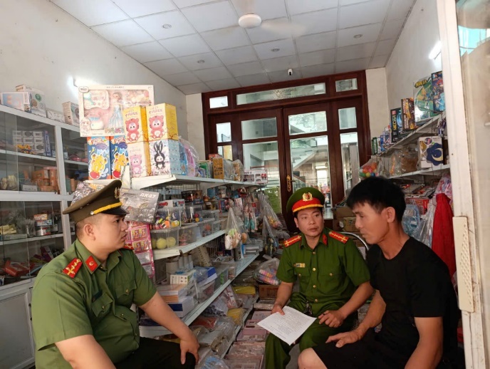 Cán bộ Công an xã Châu Ninh tuyên truyền tại một số cửa hàng