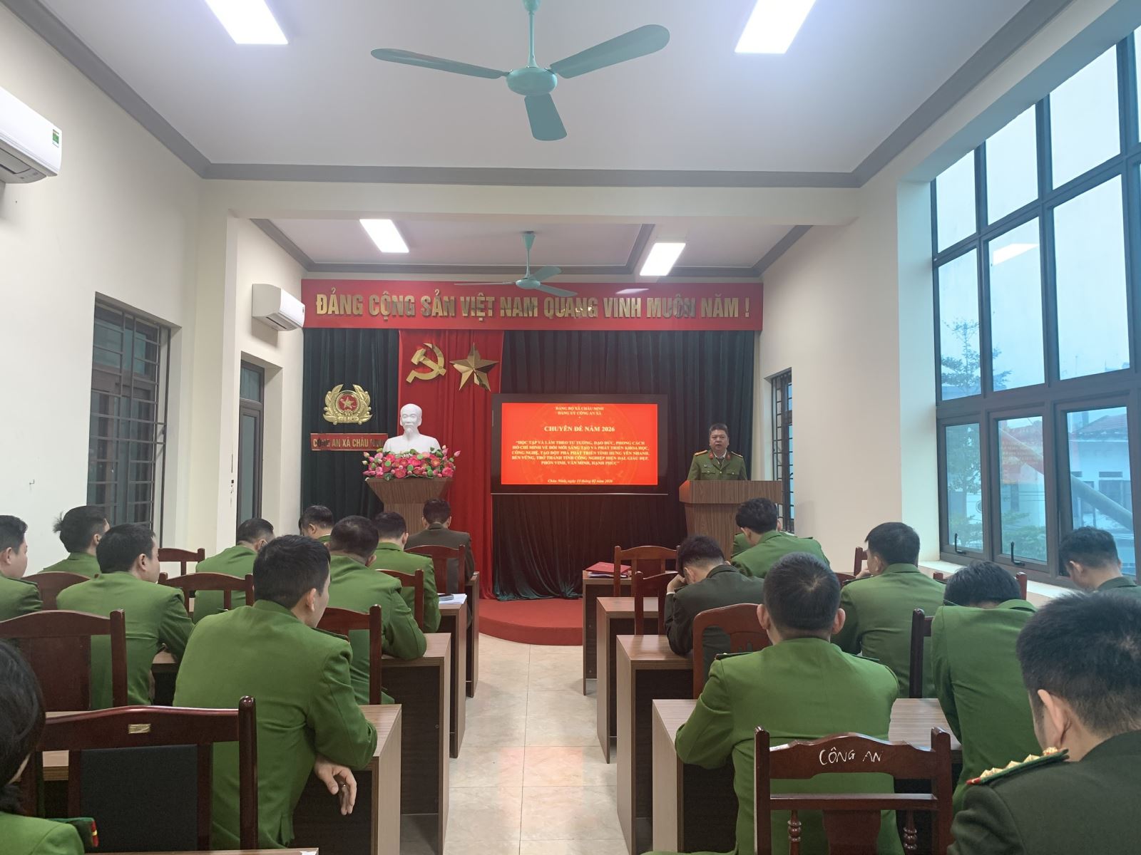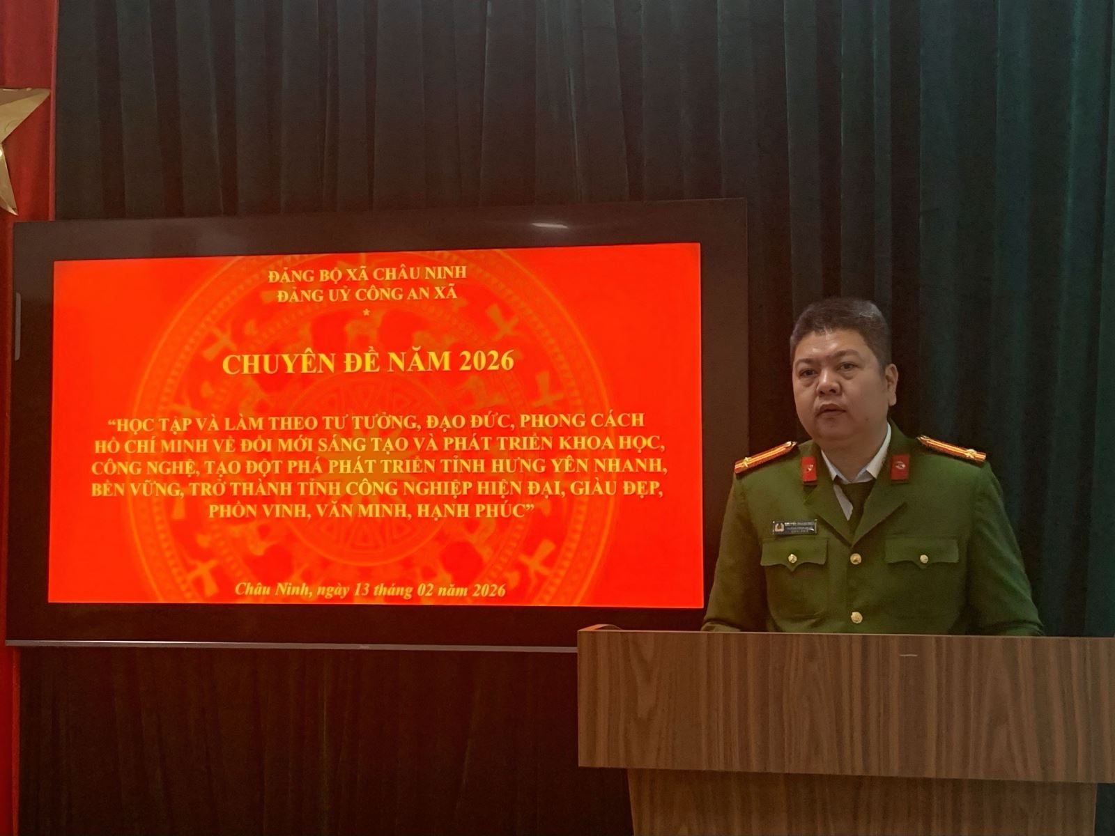 Sáng ngày 13/02/2026, Công an xã Châu Ninh tổ chức Hội nghị học tập chuyên đề năm 2026 cho toàn thể đảng viên, cán bộ, chiến sĩ trong đơn vị. Tại hội nghị, đơn vị được quán triệt những nội dung cốt lõi về tư tưởng, đạo đức, phong cách Hồ Chí Minh đối với đổi mới sáng tạo, phát triển khoa học, công nghệ; đồng thời liên hệ vận dụng vào thực tiễn công tác bảo đảm an ninh, trật tự, cải cách hành chính và chuyển đổi số tại địa phương.