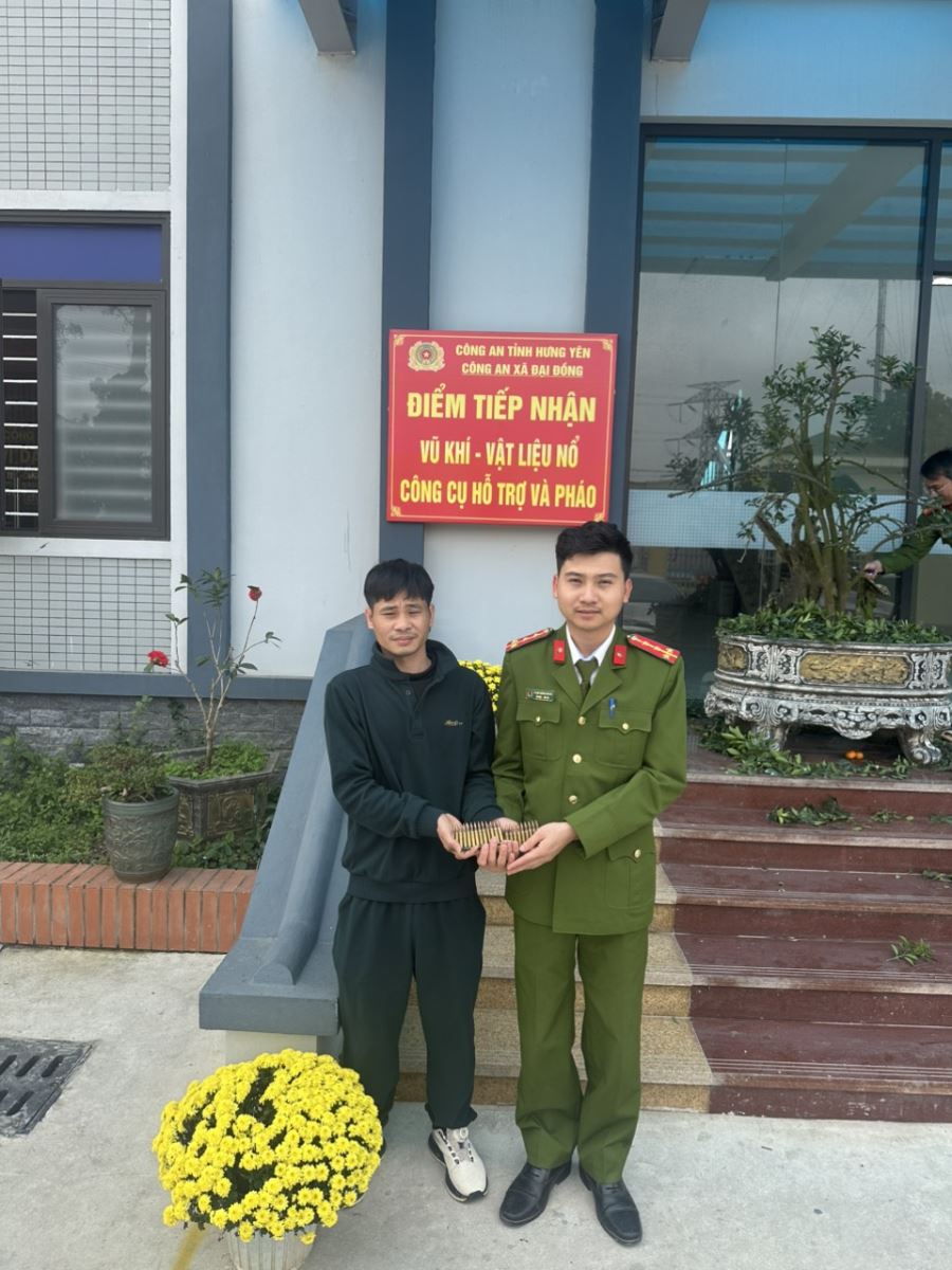 Theo đó, qua công tác tuyên truyền, vận động thu hồi vũ khí, vật liệu nổ, công cụ hỗ trợ và pháo, Ngày 23/02/2026 ( tức mùng 7 tết) Công an xã Đại Đồng đã tiếp nhận 27 viên đạn chưa qua sử dụng do anh Nguyễn Văn Anh; sn: 1989; HKTT: Thôn Đông Trại, xã Đại Đồng, tỉnh Hưng Yên, tự nguyện giao nộp. Anh Nguyễn Văn Anh cho biết khoảng 17 giờ ngày 22/02/2026 (tức ngày 06 tết) trên đường đi từ xã Như Quỳnh về nhà trên đường ĐT 385 thuộc khu vực thôn Đại Từ, xã Đại Đồng, tỉnh Hưng Yên phát hiện bọc túi bóng màu hồng bên trong chứa 27 viên đạn chưa qua sử dụng, phần đuôi viên đạn có ký hiệu LC74. Do đã được nghe tuyên truyền trên loa phát thanh của xã, nhận thấy đây là vật nguy hiểm và việc tàng trữ là vi phạm pháp luật nên đã tự giác mang đến giao nộp. Sau khi tiếp nhận, Công an xã Đại Đồng đã lập biên bản tiếp nhận và bàn giao số đạn trên tới cơ quan chức năng để quản lý theo đúng quy định.