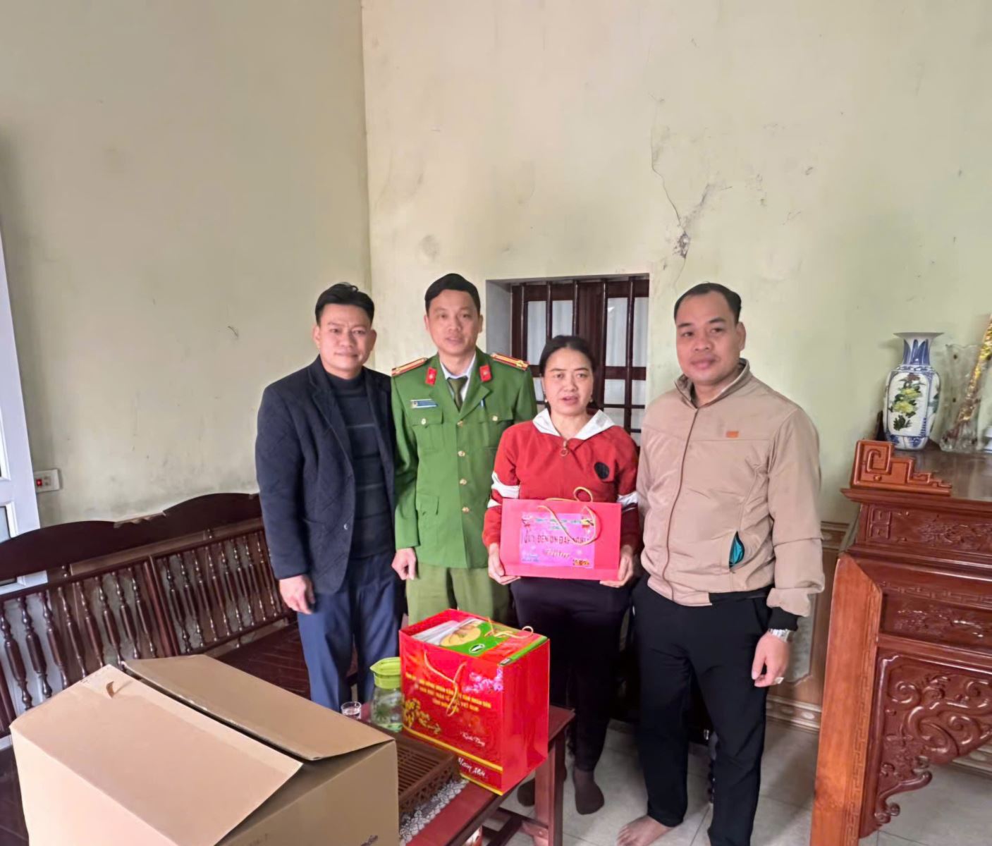 Đồng chí Trung tá Vũ Ngọc Doanh - Ủy viên BTV Đảng ủy, Trưởng CA xã cùng đoàn công tác tặng quà cho gia đình chính sách, người có công trên địa bàn thôn Đồng Bằng, xã Đồng Bằng.