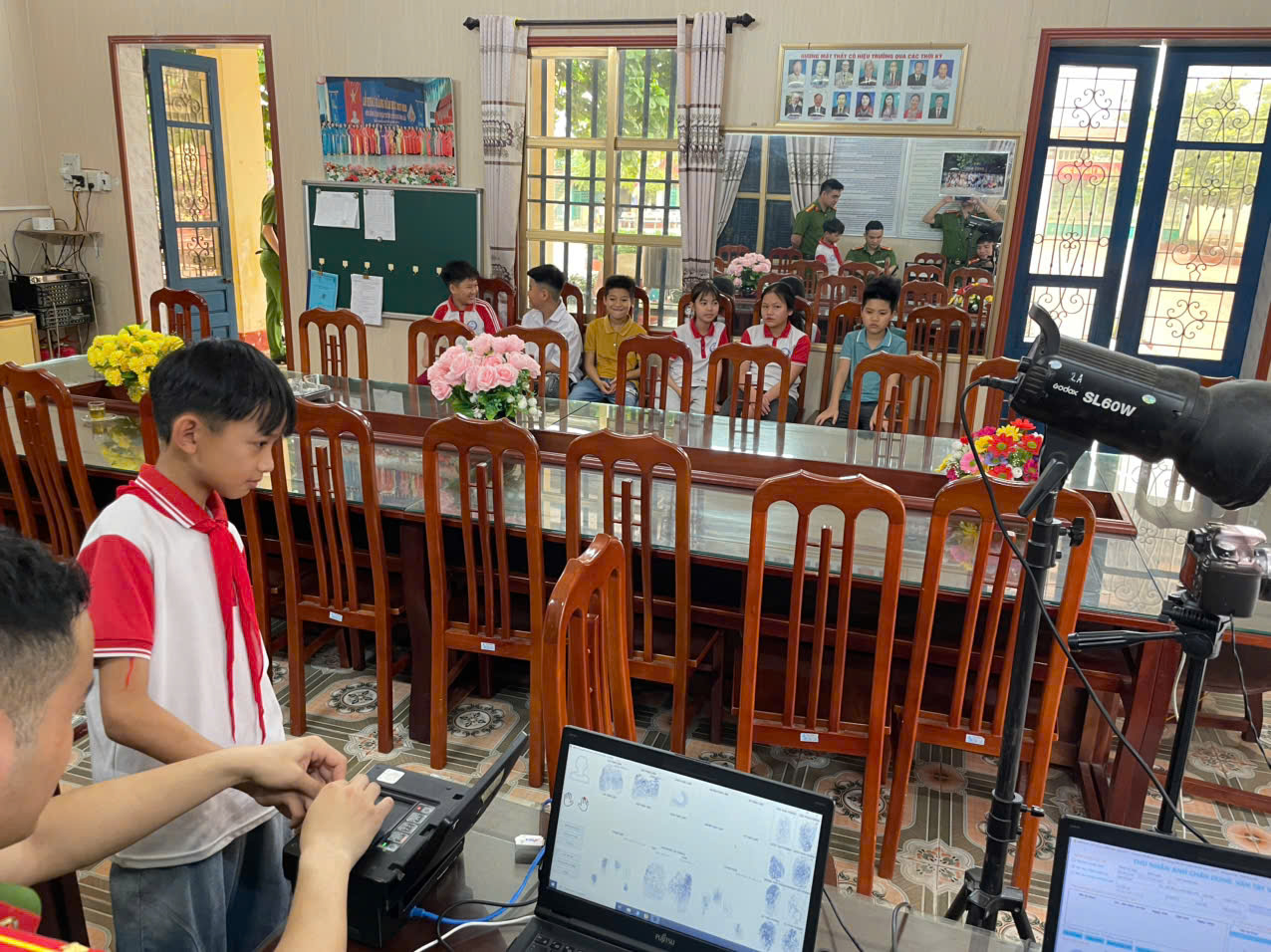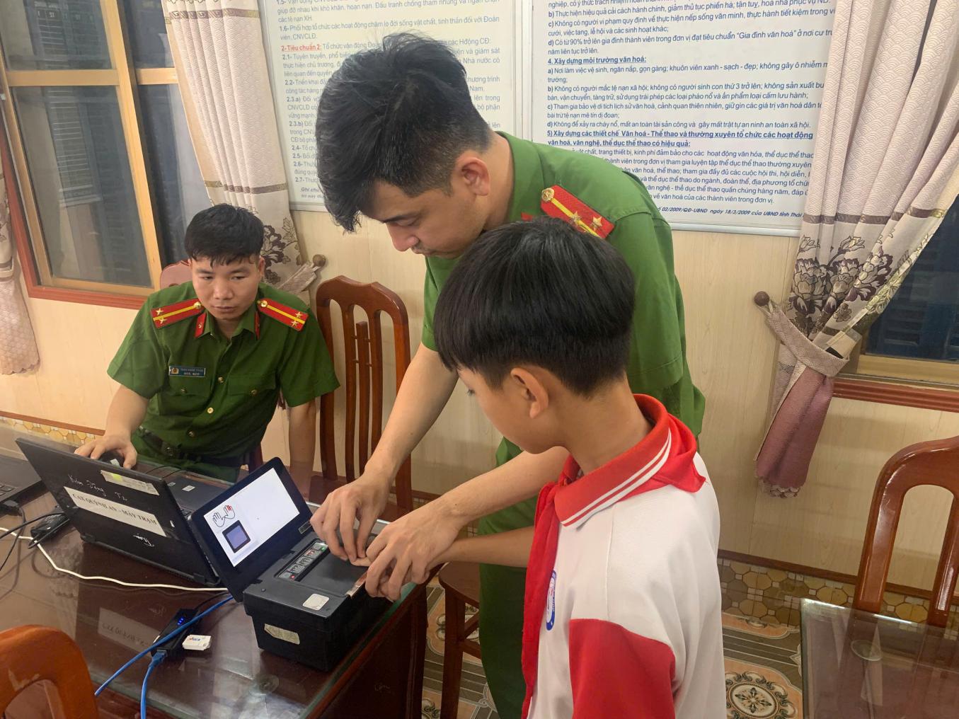 Cán bộ công an xã đang thực hiện thủ tục cấp căn cước cho các em học sinh