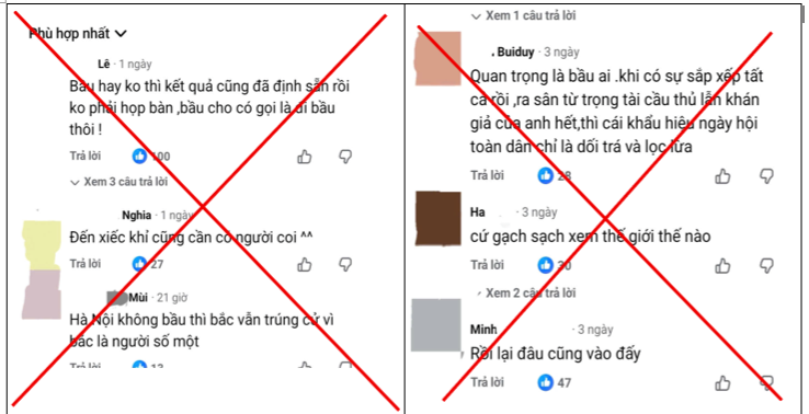Ngay sau ngày bầu cử đại biểu Quốc hội khóa XVI và đại biểu Hội đồng nhân dân (HĐND) các cấp nhiệm kỳ 2026-2031 – ngày 15/3/2026 – các thế lực thù địch, phần tử cơ hội chúng tung tin như: “kết quả HĐND đã được sắp đặt từ trước”, “danh sách trúng cử ấn định”, “cử tri chỉ bầu cho có lệ, chứ kết quả có sẵn rồi”… Đây là các chiêu bài, các luận điệu cũ rích bằng cách sử dụng mạng internet qua các tài khoản, mạng xã hội như: Facebook, Telegram, Tiktok, X …. Từ tài khoản ẩn danh, các tài khoản có thông tin không thật, thậm chí chúng còn tạo lập các video, bản tin bằng các công cụ AI với tốc độ khung hình chậm, lời nói và hoạt động miệng, cử chỉ không đồng nhất, bối cảnh không có thật … để đánh lừa những người thiếu khả năng nhận diện nhằm hạ thấp giá trị dân chủ ở cơ sở; làm suy giảm niền tin của nhân dân vào bộ máy chính quyền địa phương do mình trực tiếp bầu ra. Rồi dần từ bộ phận nhỏ trong nhân dân, rồi lan rộng tạo thành làn sóng phản đối, gây bất ổn địa phương và trong cả nước.