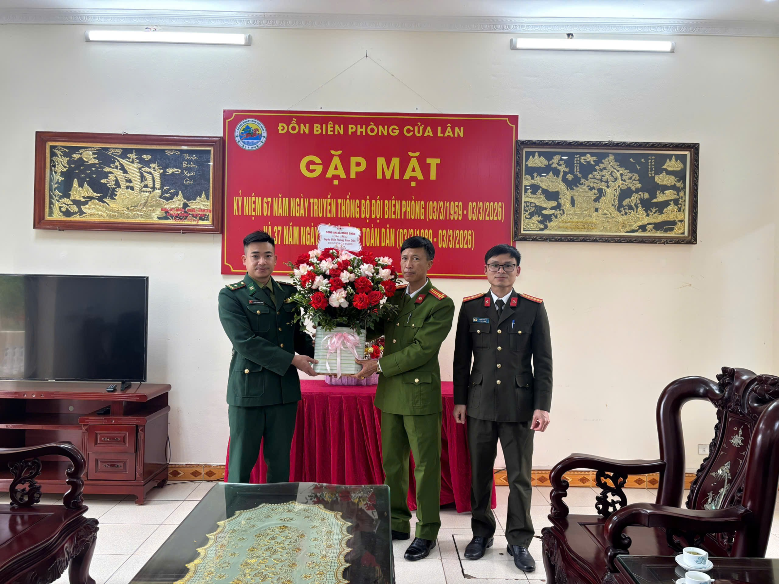 Đồng chí Phan Văn Nhiệm, Phó trưởng Công an xã Đồng Châu tặng hoa chúc mừng CBCS Đồn Biên phòng Cửa Lân