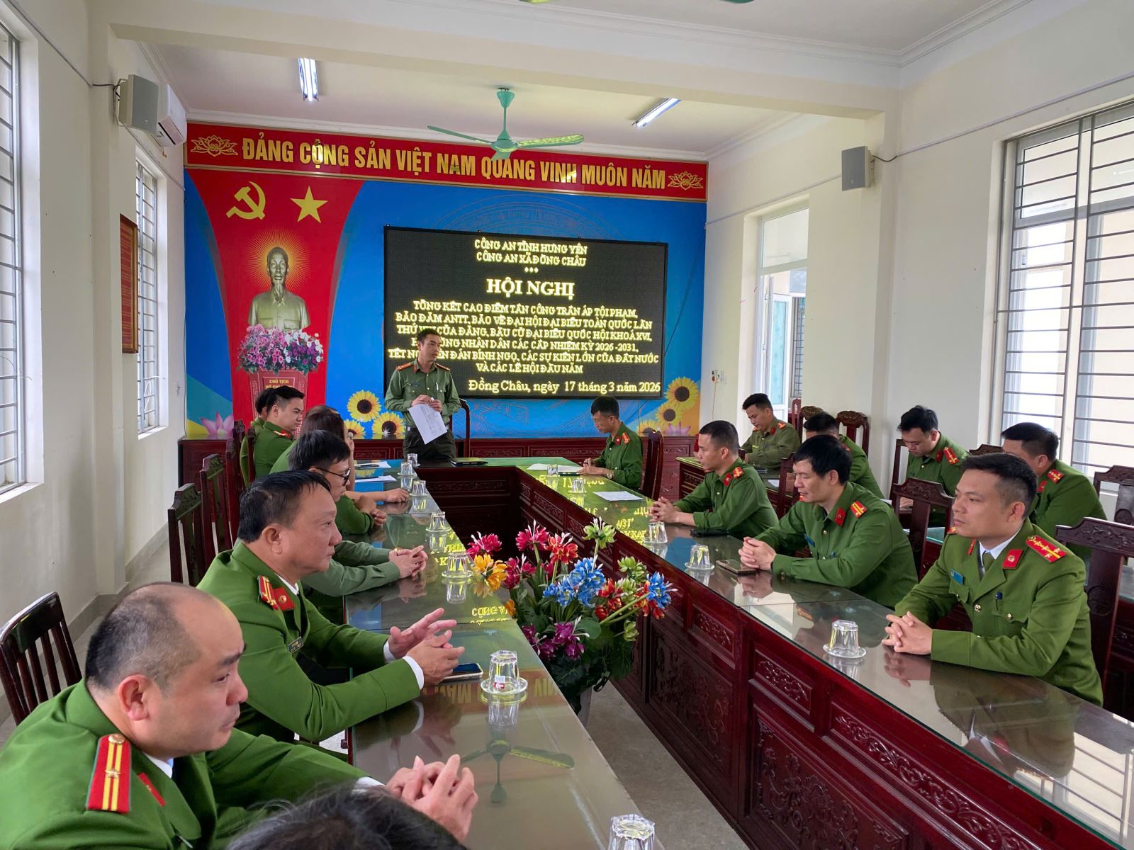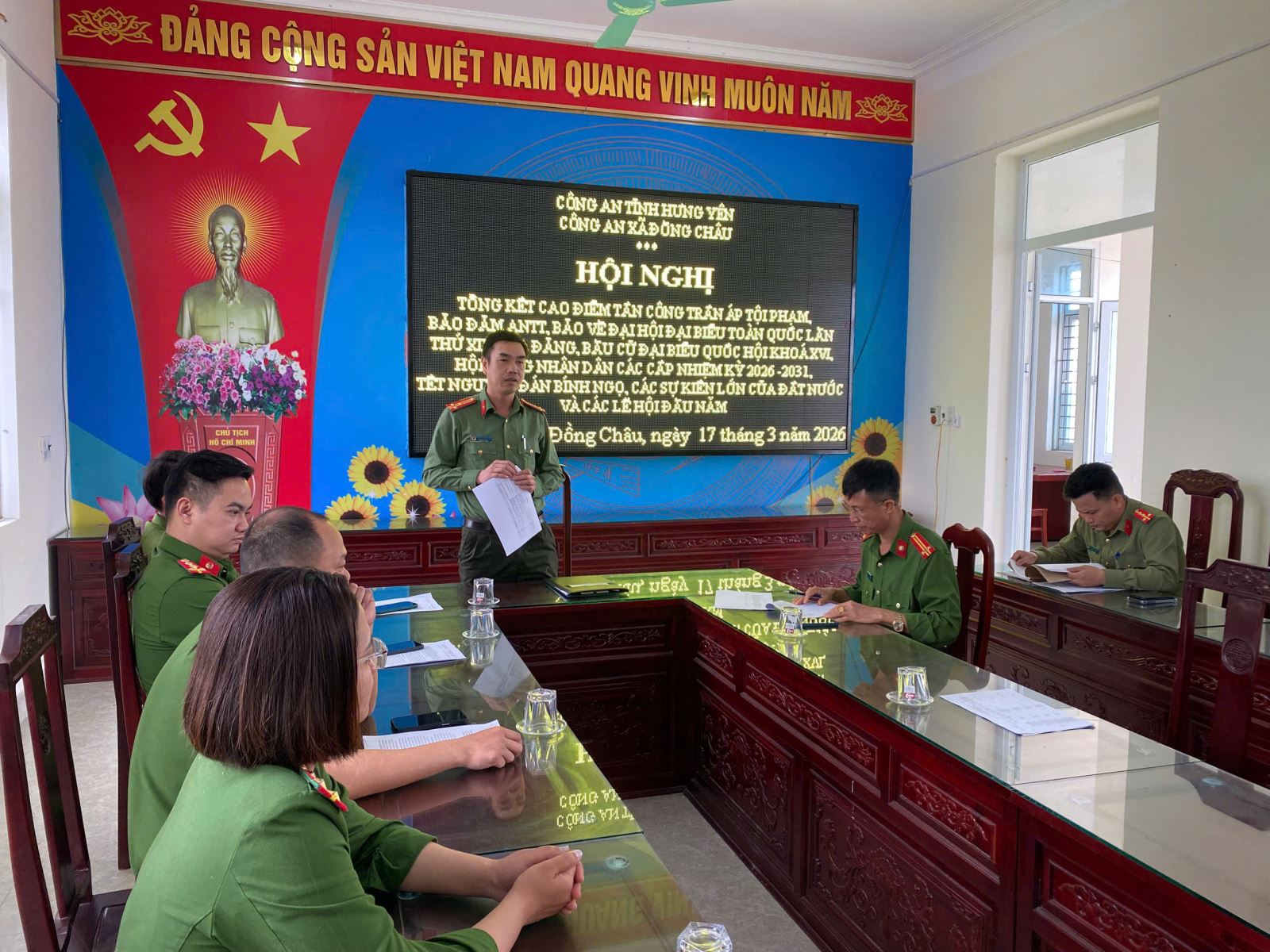 Hội nghị được tổ chức trong không khí nghiêm túc, trách nhiệm với sự tham dự của lãnh đạo, cán bộ chiến sĩ Công an xã Đồng Châu. Hội nghị đã được nghe báo cáo đánh giá toàn diện kết quả thực hiện đợt cao điểm tấn công, trấn áp tội phạm trong thời gian qua, đồng thời thảo luận, rút ra những kinh nghiệm trong công tác đảm bảo an ninh trật tự tại cơ sở.