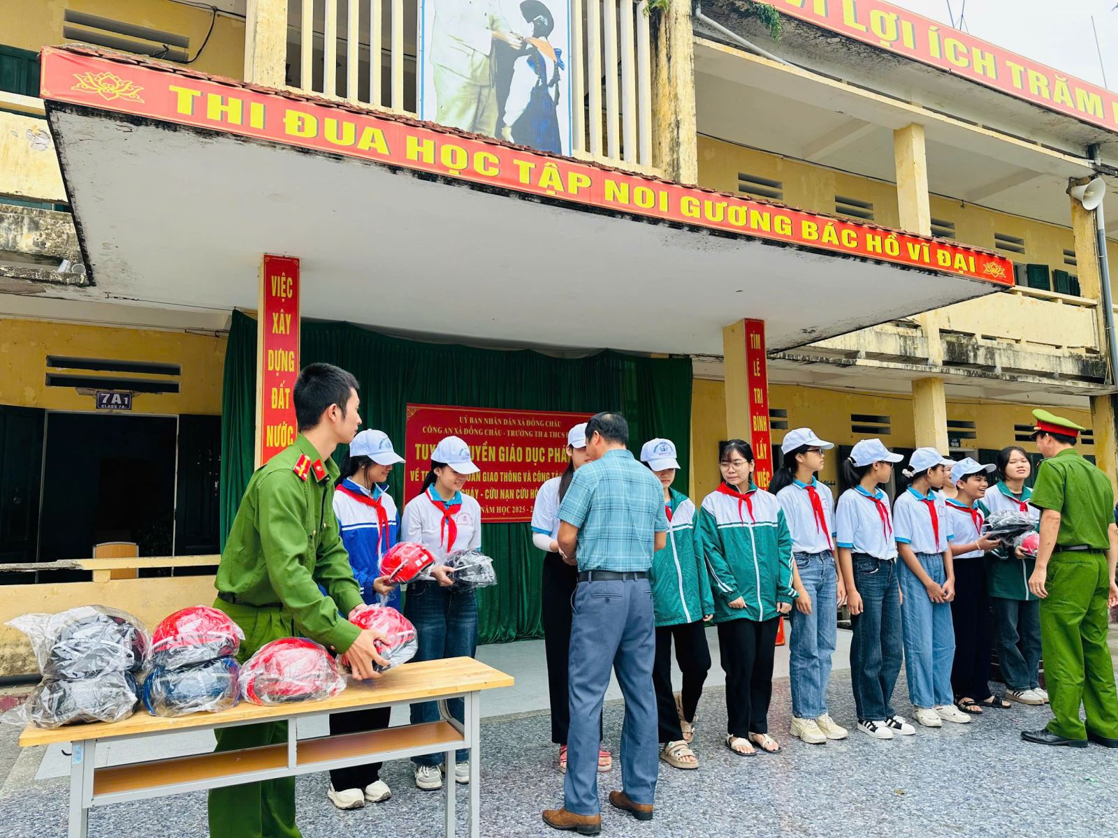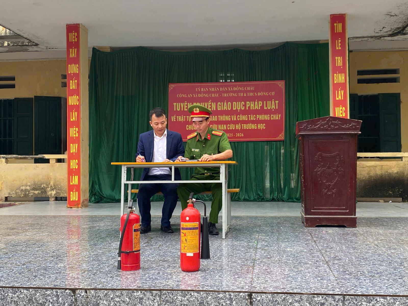 Sáng ngày 30/10/2025, Công an xã Đồng Châu phối hợp với Trường Tiểu học – Trung học cơ sở Đông Cơ, xã Đồng Châu, tỉnh Hưng Yên tổ chức tuyên truyền và ký cam kết chấp hành Luật Trật tự an toàn giao thông đường bộ, kỹ năng tham gia giao thông an toàn, kỹ năng thoát nạn và phòng cháy, chữa cháy cho 407 học sinh cùng cán bộ, giáo viên nhà trường.