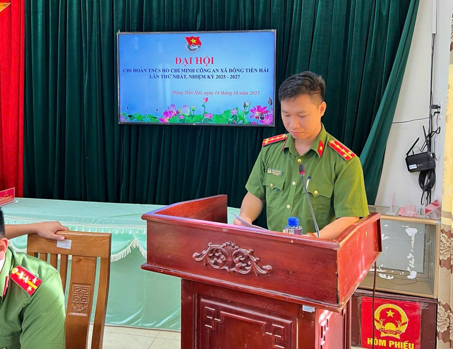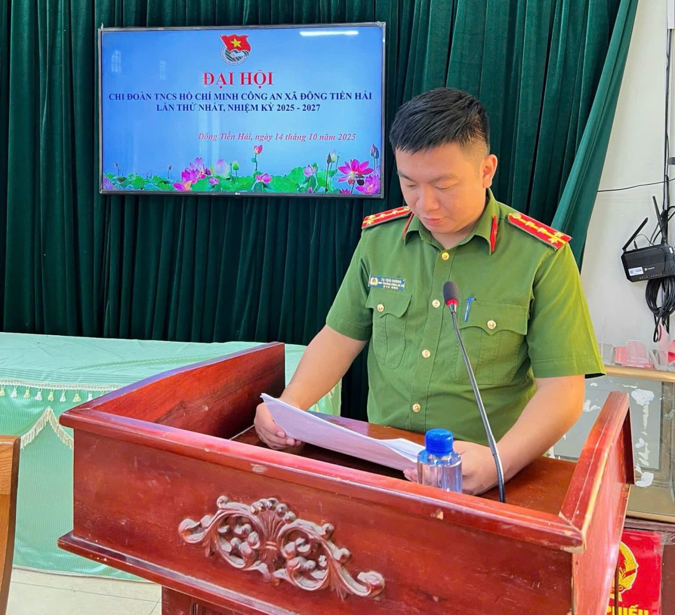 Phát biểu chỉ đạo Đại hội, đồng chí Đại úy Ngô Văn Thắng - Phó Trưởng Công an xã Đông Tiền Hải chúc mừng Đại hội Chi đoàn Công an xã lần thứ nhất, nhiệm kỳ 2025-2027 luôn đoàn kết thống nhất, năng động, sáng tạo, phát huy vai trò xung kích của tuổi trẻ, góp phần xây dựng lực lượng Công an xã trong sạch, vững mạnh, chính quy, tinh nhuệ, hiện đại. Tiếp tục đổi mới phương thức hoạt động gắn phong trào thanh niên với nhiệm vụ chính trị của đơn vị. Mỗi đoàn viên không ngừng học tập, rèn luyện nâng cao bản lĩnh chính trị, trình độ chuyên môn, nghiệp vụ, chấp hành kỷ luật, kỷ cương, điều lệnh CAND; gương mẫu trong công việc, trong cuộc sống, giữ gìn hình ảnh đẹp của người chiến sĩ Công an nhân dân Việt Nam.