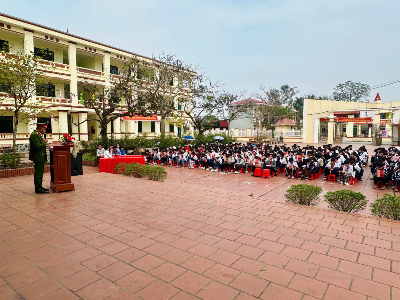 Cũng trong chương trình, các báo cáo viên của Công an xã đã có phần trao đổi, hỏi – đáp tình huống thực tế được lồng ghép sinh động, giúp học sinh dễ hiểu, dễ nhớ, nâng cao kỹ năng nhận diện và phòng tránh vi phạm. Không chỉ dừng lại ở tuyên truyền trực tiếp, Công an xã Hiệp Cường còn phát 500 tờ rơi, treo băng rôn tại Trường THCS Hiệp Cường 2 và đồng loạt triển khai tại các trường trên địa bàn như Trường THCS Hiệp Cường 1, Trường liên cấp THCS và Tiểu học Hiệp Cường 1 và 2, tạo hiệu ứng lan tỏa rộng khắp trong môi trường học đường.