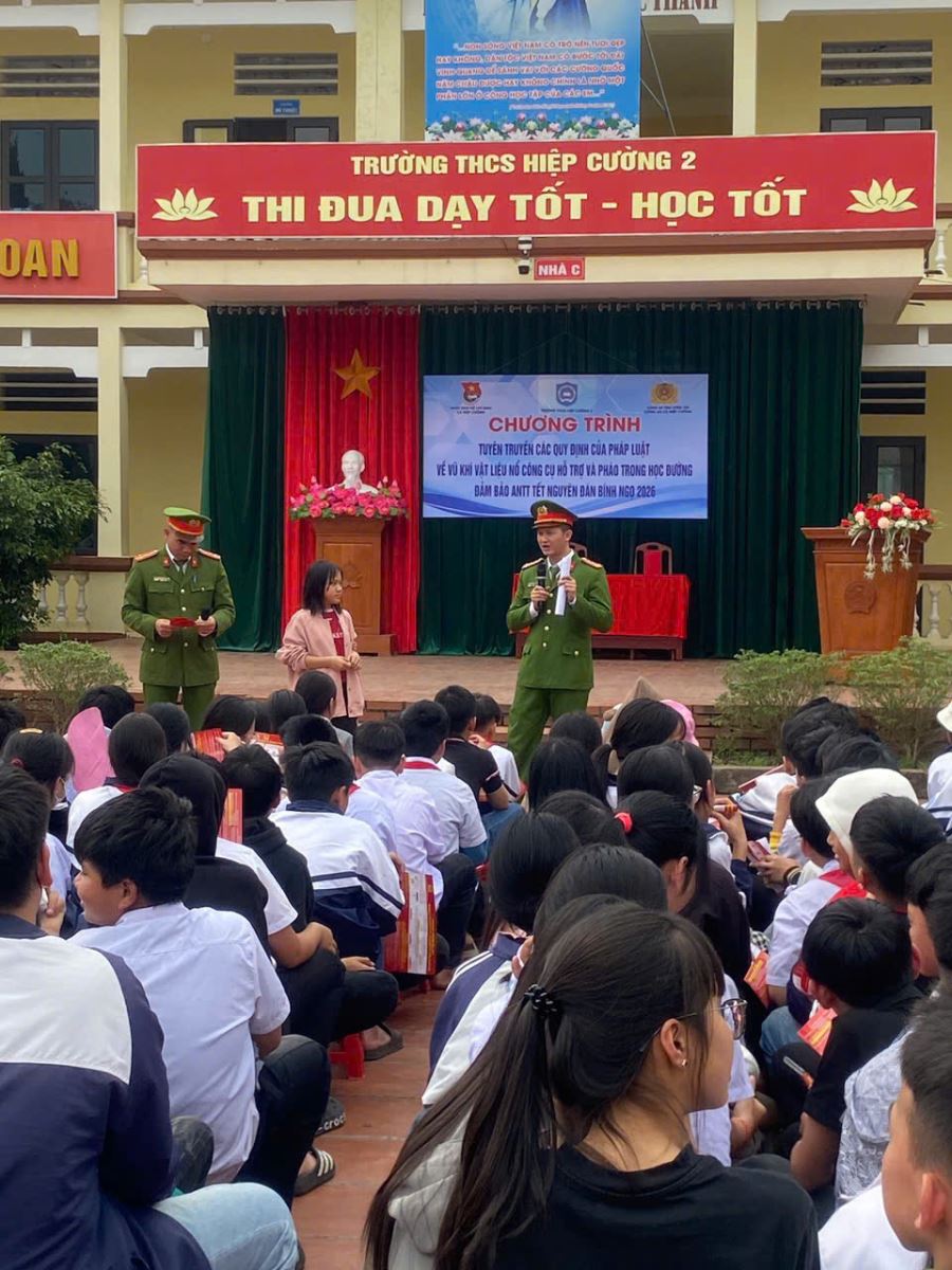 Chiều 10/02/2026, Công an xã Hiệp Cường phối hợp với Trường THCS Hiệp Cường 2 và Đoàn Thanh niên xã tổ chức buổi tuyên truyền cho 480 cán bộ, giáo viên, học sinh. Hoạt động được chuẩn bị bài bản, nội dung thiết thực, sát với tình hình thực tế địa phương, thể hiện tinh thần chủ động “đi từng ngõ, phối hợp từng trường, đến từng lớp” trong công tác phòng ngừa vi phạm.