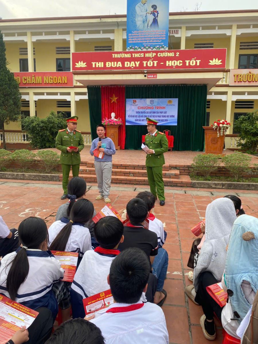 Tại buổi tuyên truyền, Trung tá Đào Xuân Tú – Phó Trưởng Công an xã Hiệp Cường đã trực tiếp phổ biến những nội dung trọng tâm của Luật Quản lý, sử dụng vũ khí, vật liệu nổ và công cụ hỗ trợ; quy định của pháp luật về quản lý, sử dụng pháo; phân tích rõ các hành vi bị nghiêm cấm và chế tài xử lý. Đồng chí cũng nhấn mạnh: “Việc tăng cường giáo dục pháp luật cho học sinh là giải pháp quan trọng nhằm phòng ngừa vi phạm từ sớm, từ xa. Đề nghị cán bộ, giáo viên và học sinh tuyệt đối không tham gia sản xuất, mua bán, tàng trữ, vận chuyển, sử dụng trái phép vũ khí, vật liệu nổ, công cụ hỗ trợ và pháo; đồng thời tích cực tuyên truyền tới gia đình, người thân cùng chấp hành nghiêm quy định của pháp luật”.