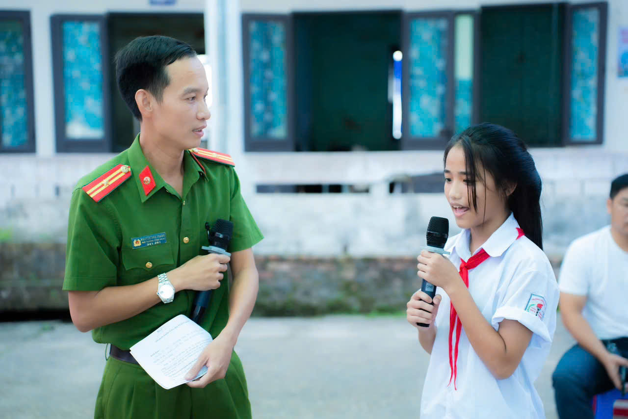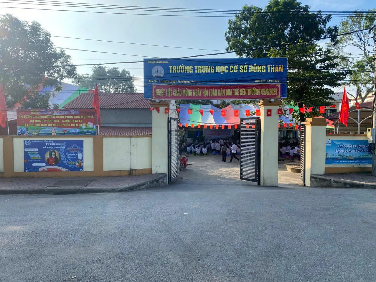 Ngay từ sáng sớm, sân trường rộn ràng với cờ, băng rôn, khẩu hiệu rực rỡ. Các em học sinh, giáo viên và phụ huynh đều háo hức đón chờ buổi tuyên truyền đặc biệt do Công an xã Hoàn Long trực tiếp thực hiện.