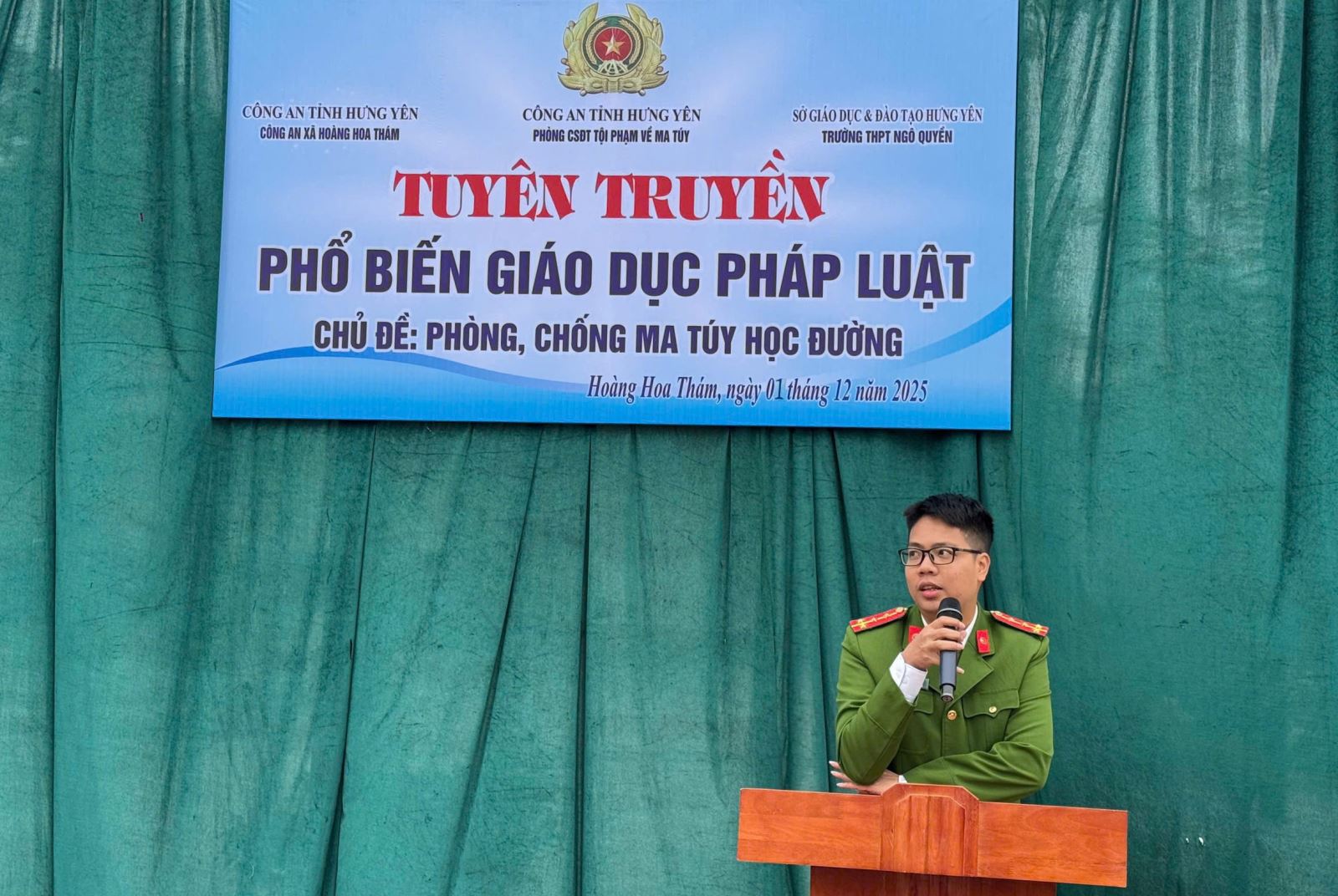 Sáng ngày 01/12/2025, Công an xã Hoàng Hoa Thám phối hợp Phòng Cảnh sát điều tra tội phạm về ma túy cùng trường THPT Ngô Quyền tổ chức Chương trình tuyên truyền phổ biến giáo dục pháp luật với chủ đề phòng, chống ma túy học đường.