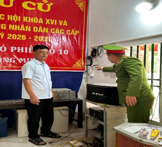 Công an xã Hồng Minh kiểm tra thiết bị điện tại điểm bầu cử