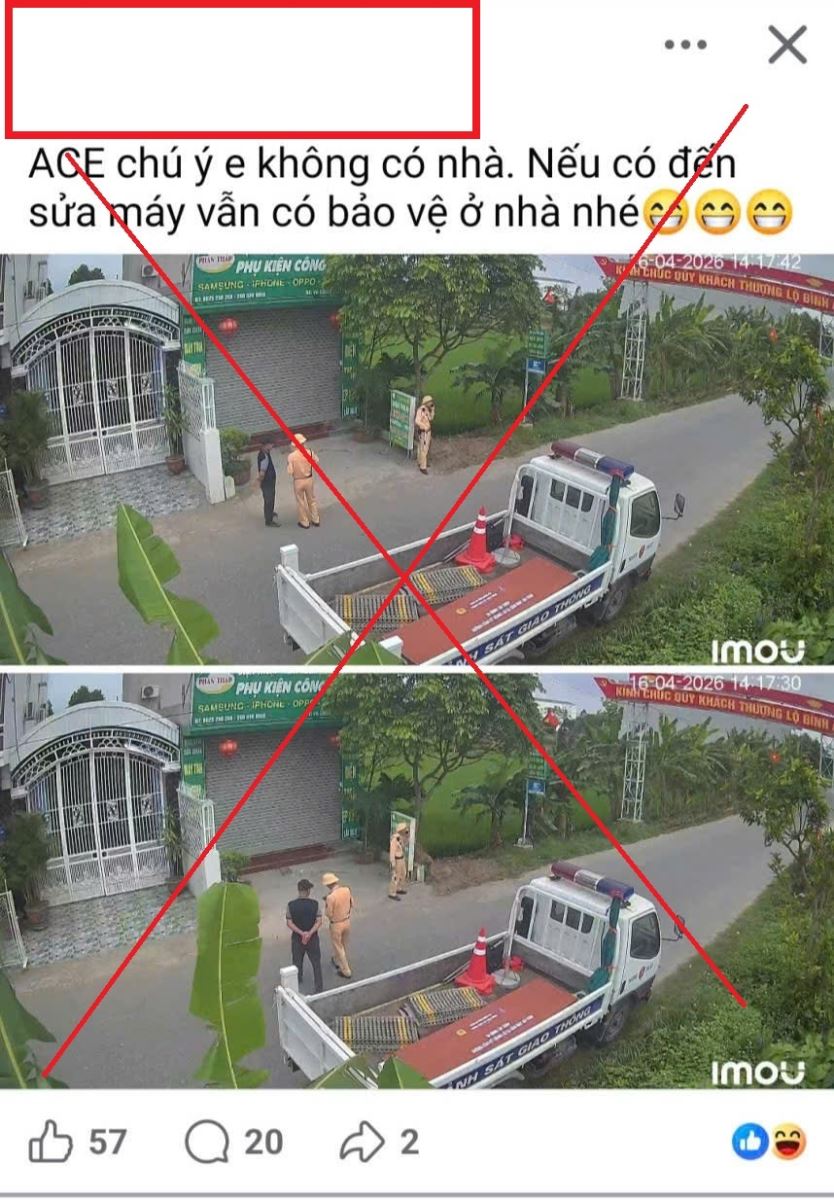 Qua công tác nắm tình hình, ngày 16/4/2026, Công an xã Hồng Vũ đã phát hiện 01 trường hợp là P.V.T (sinh năm 1986), trú tại thôn Trà Vy Nam, xã Hồng Vũ, tỉnh Hưng Yên sử dụng tài khoản Facebook cá nhân đăng tải bài viết có nội dung: “ACE chú ý e không có nhà. Nếu có đến sửa máy vẫn có bảo vệ ở nhà nhé” kèm theo bài viết là 02 hình ảnh chụp lực lượng Cảnh sát giao thông đang thực hiện nhiệm vụ qua camera của hộ gia đình. Ngay sau đó, Công an xã đã mời anh T lên trụ sở làm việc.