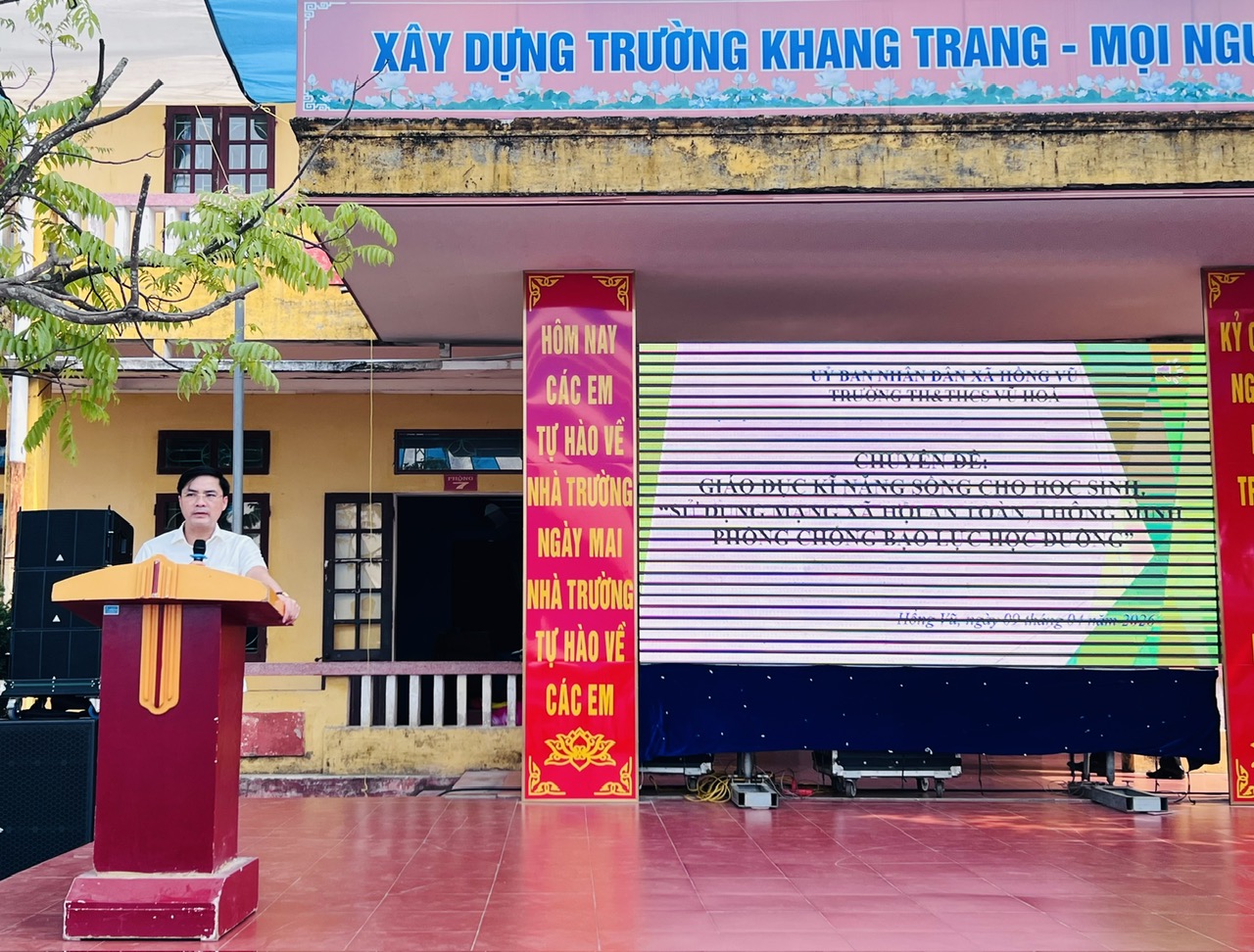 Chiều ngày 09/4/2026, tại trường Tiểu học và Trung học cơ sở Vũ Hòa, Công an xã Hồng Vũ phối hợp với Ban Giám hiệu nhà trường tổ chức buổi tuyên truyền chuyên đề “An toàn trên không gian mạng” cho gần 800 cán bộ, giáo viên và học sinh. Dự và chỉ đạo có các đồng chí trong Ban Thường vụ Đảng uỷ, Hội đồng nhân dân, Uỷ ban nhân dân xã Hồng Vũ.