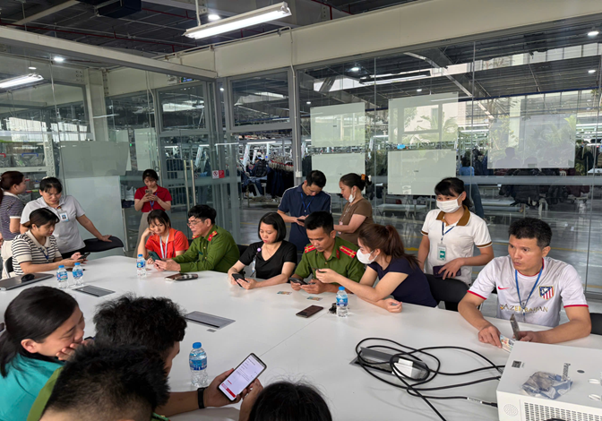 Công an xã Hưng Hà tuyên truyền và hỗ trợ công nhân cài đặt App “Báo cháy 114”